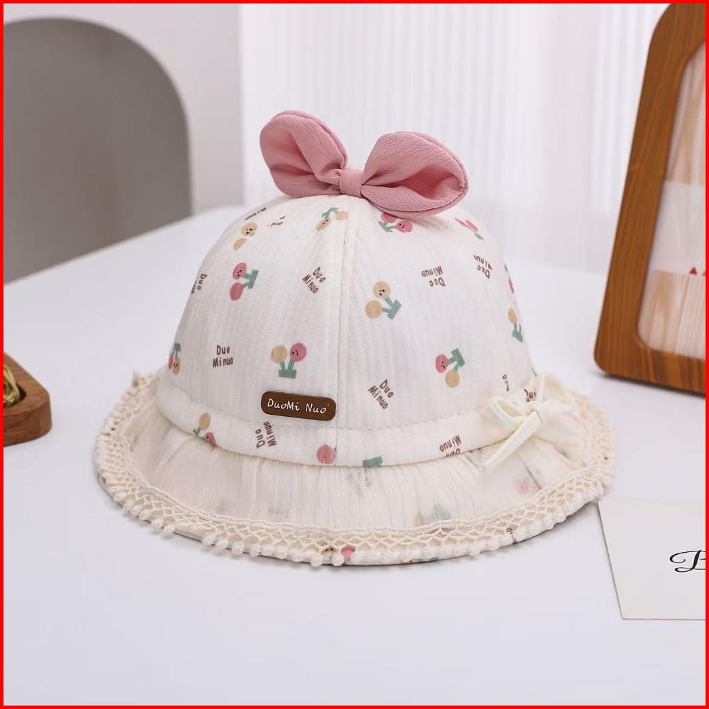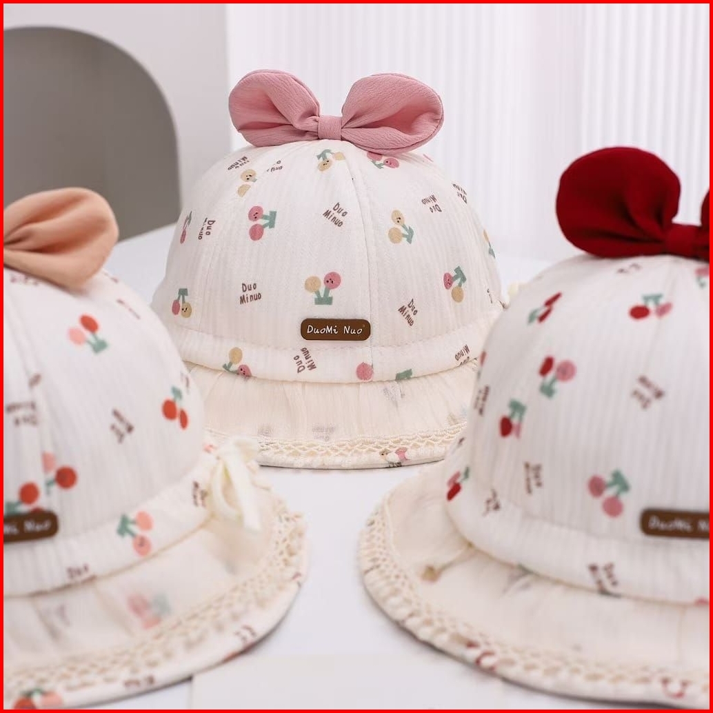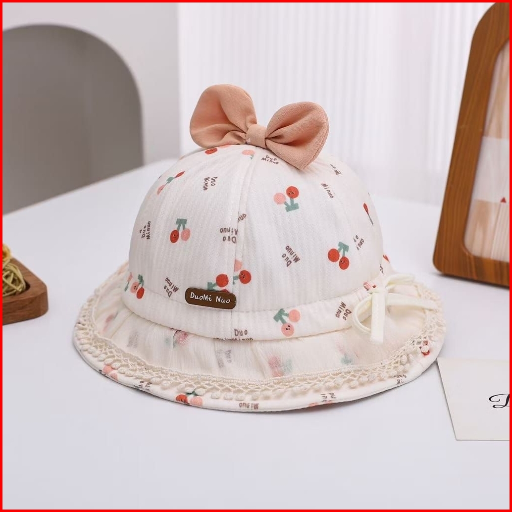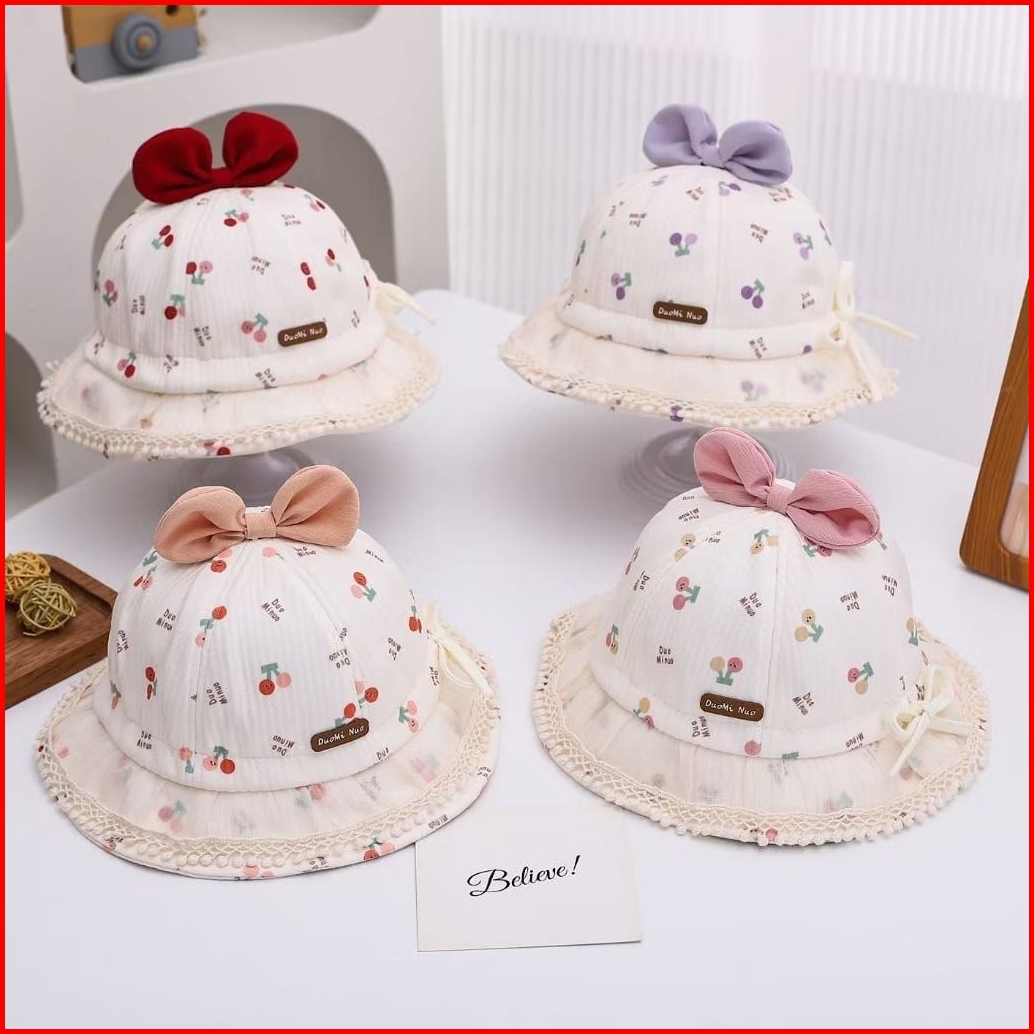 Bucket Hat Baby Perempuan Cerry Rumbai Duomi Nuo Colorfull Pita Cherry Topi Bayi Renda Girl