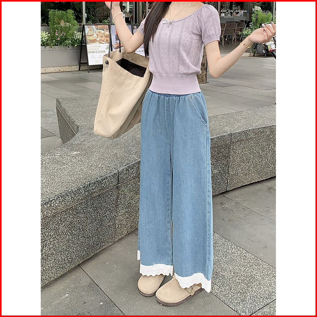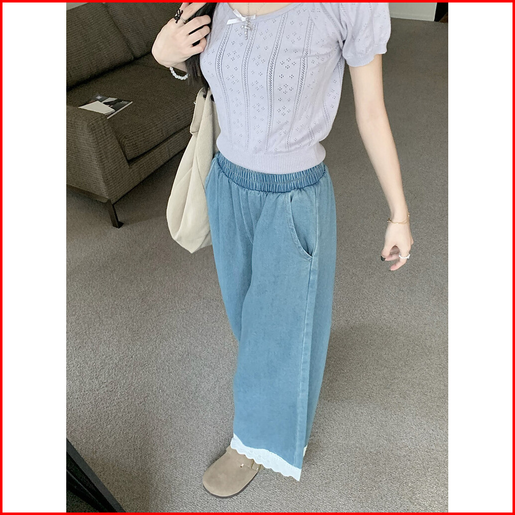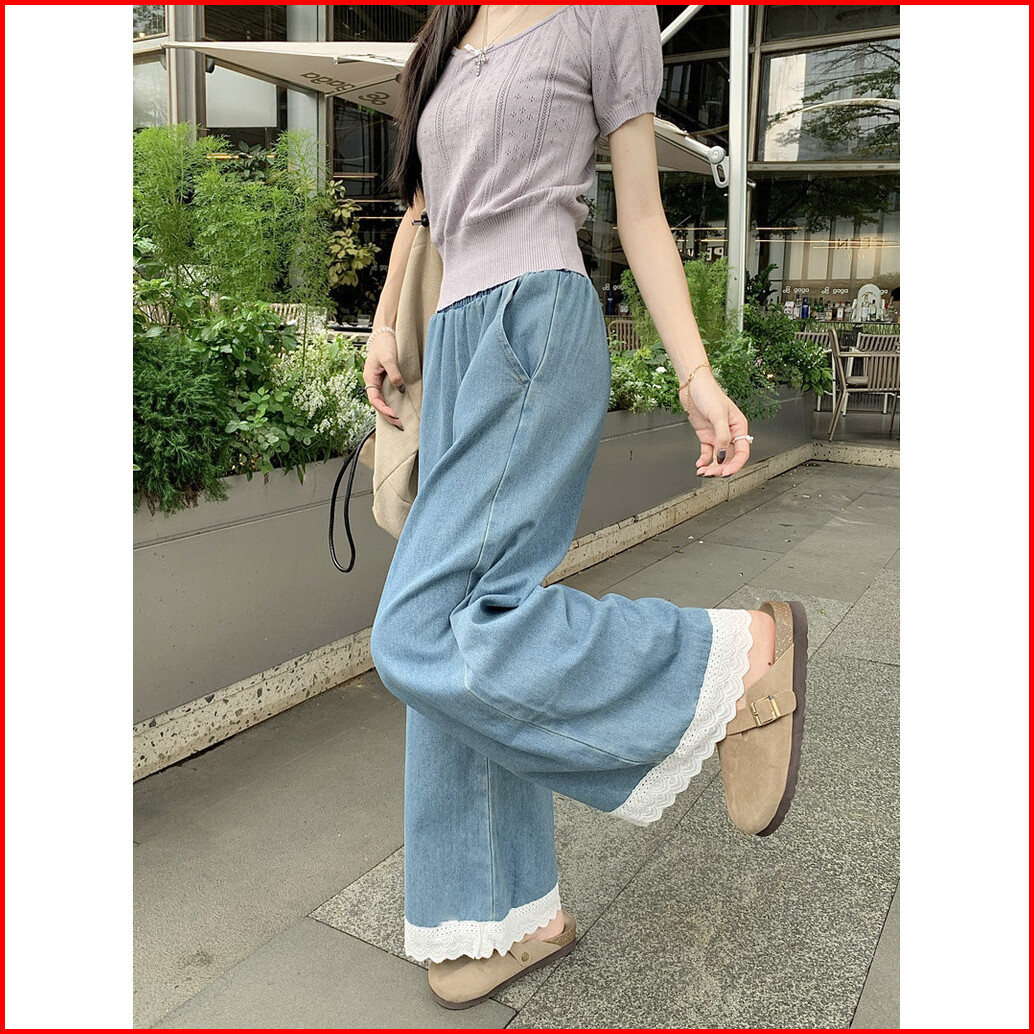Celana Jeans Dengan Kombinasi Renda Celana Kaki Lebar Pinggang Elastis Longgar