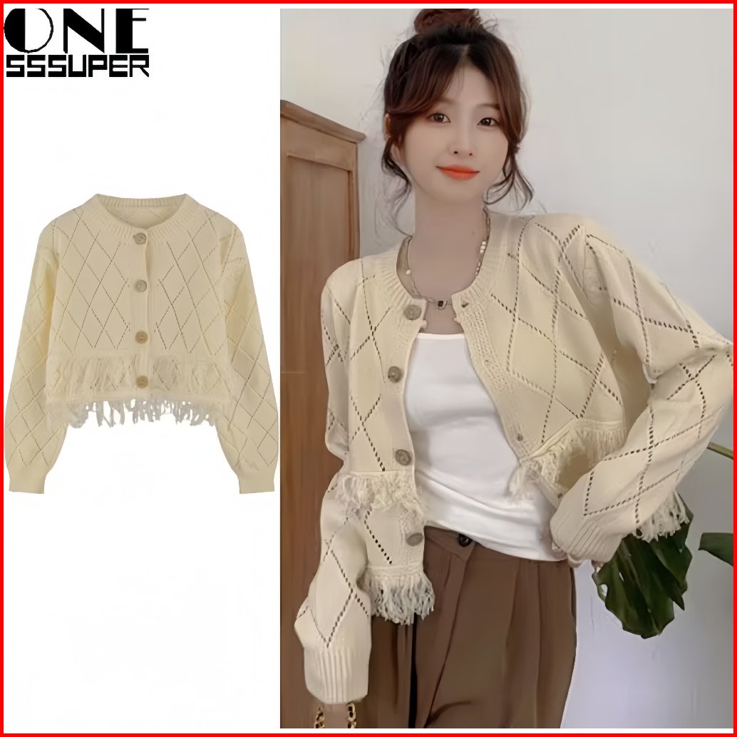 Cardigan Rajut Crop Wanita Fringe Diamond Pattern