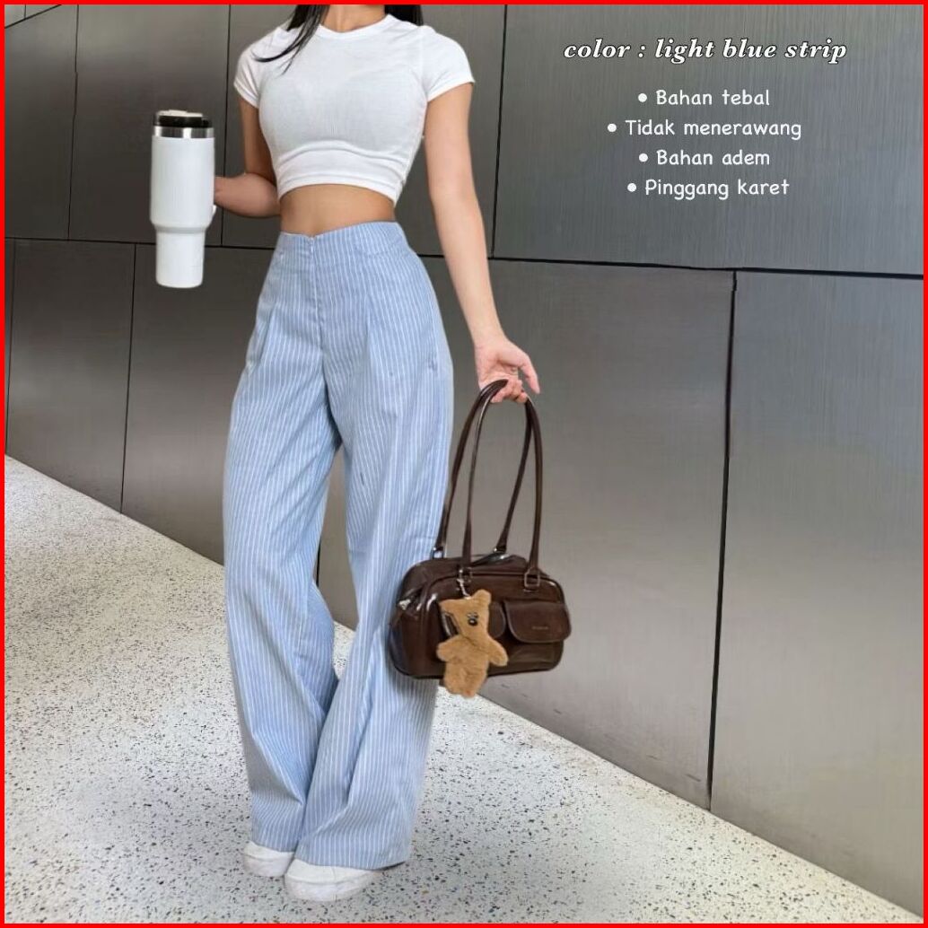 City Pants - Celana Tidur Tipis Panjang Wanita Kantor Kuliah Motif Garis Kulot Pinstripe Karet Lembut Loosecity Pants -