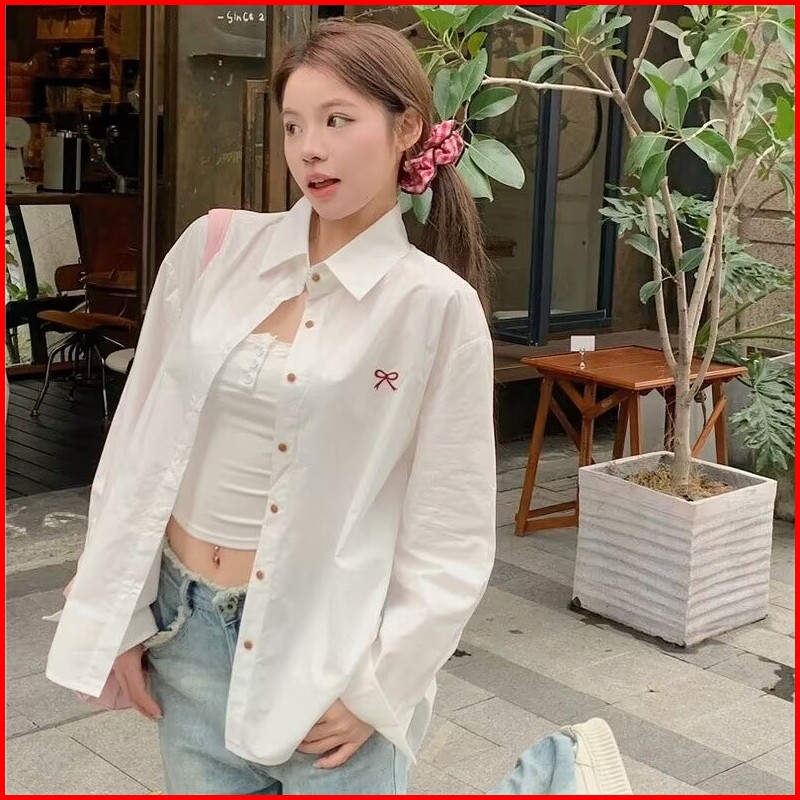 Kemeja Lengan Panjang Wanita Gaya Korea Longgar Bordir Lengan Panjang Atasan Kemeja