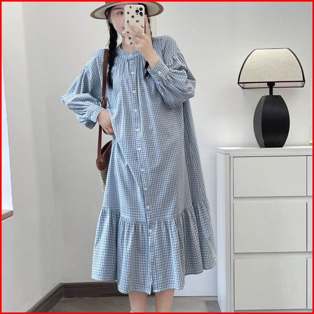 Ready Stockchicmore Gaun Wanita Longgar Motif Kotak-kotak Segar Desain Kemeja Lengan Panjang Leher Bulat Tali Lipit Baha