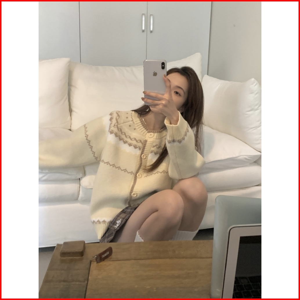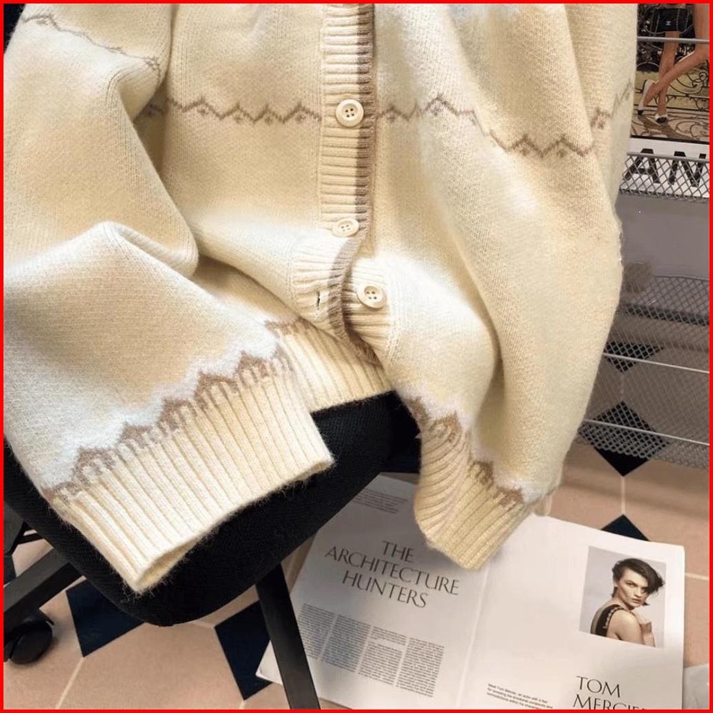 Kouyoo Cardigan Imut Motif Zig Zag Beige Halus Korean Style-santai Rajut Wol Outer Krem