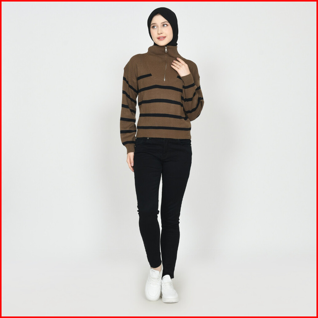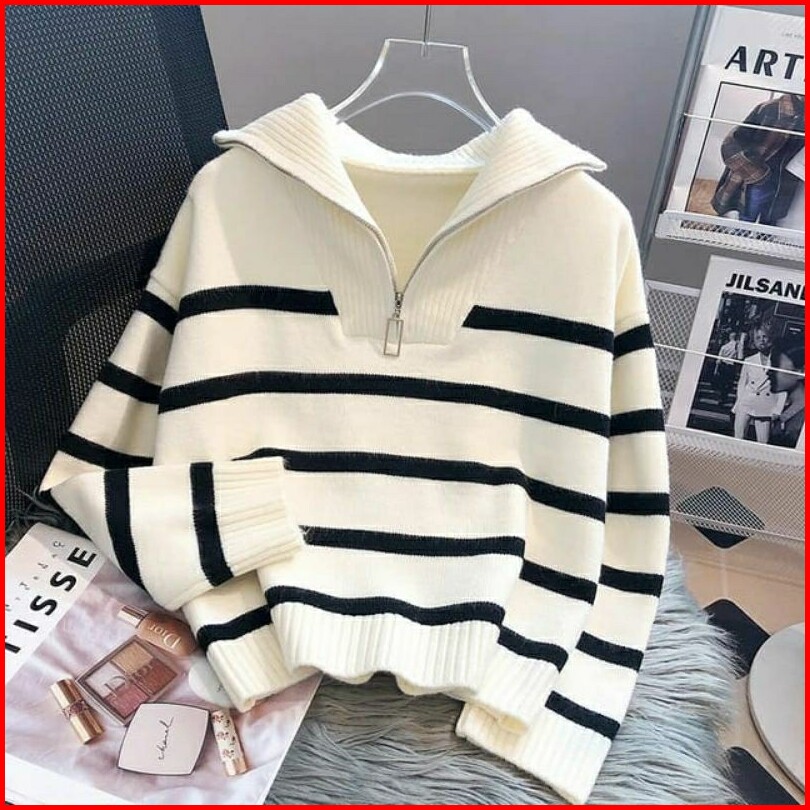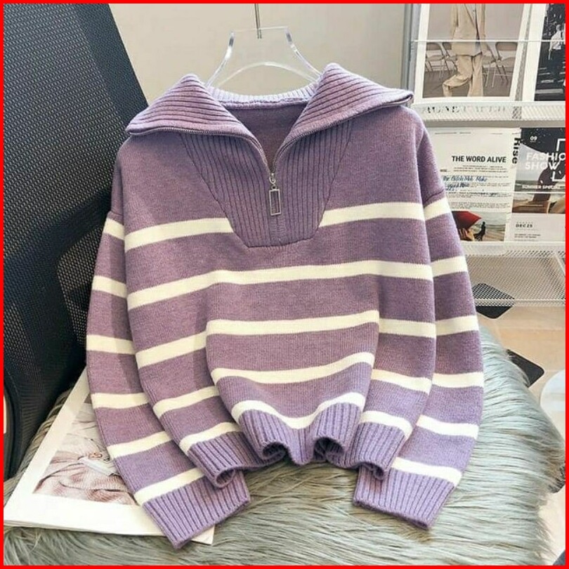 Cardigan Sweater Stripe Classy Zipper Rajut Kerah Resleting Cardigan Kerah Resleting Zipper Kardigan Sleting Korean