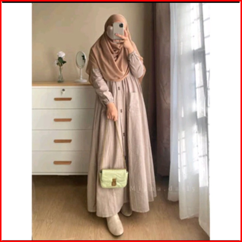 Azzura Dress Gamis Pesta Syari Pengajian Wanita Terbaru Jubah Kekinian Cotton Rami Full Kancing Depan Tangan Karet Serut