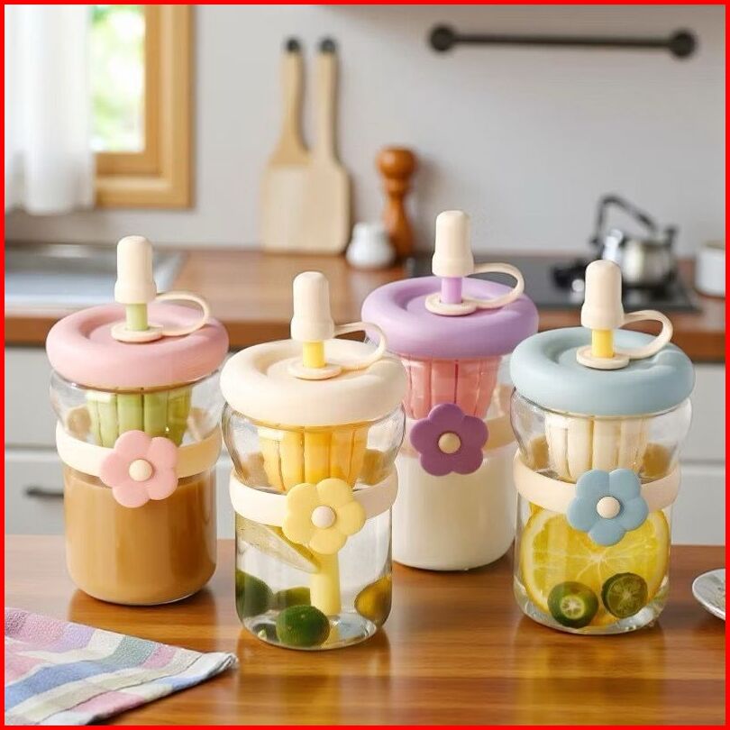 Tumbler Kaca Aesthetic Bunga Sedotan Silikon Botol Minum Anti Bocor 400 Ml