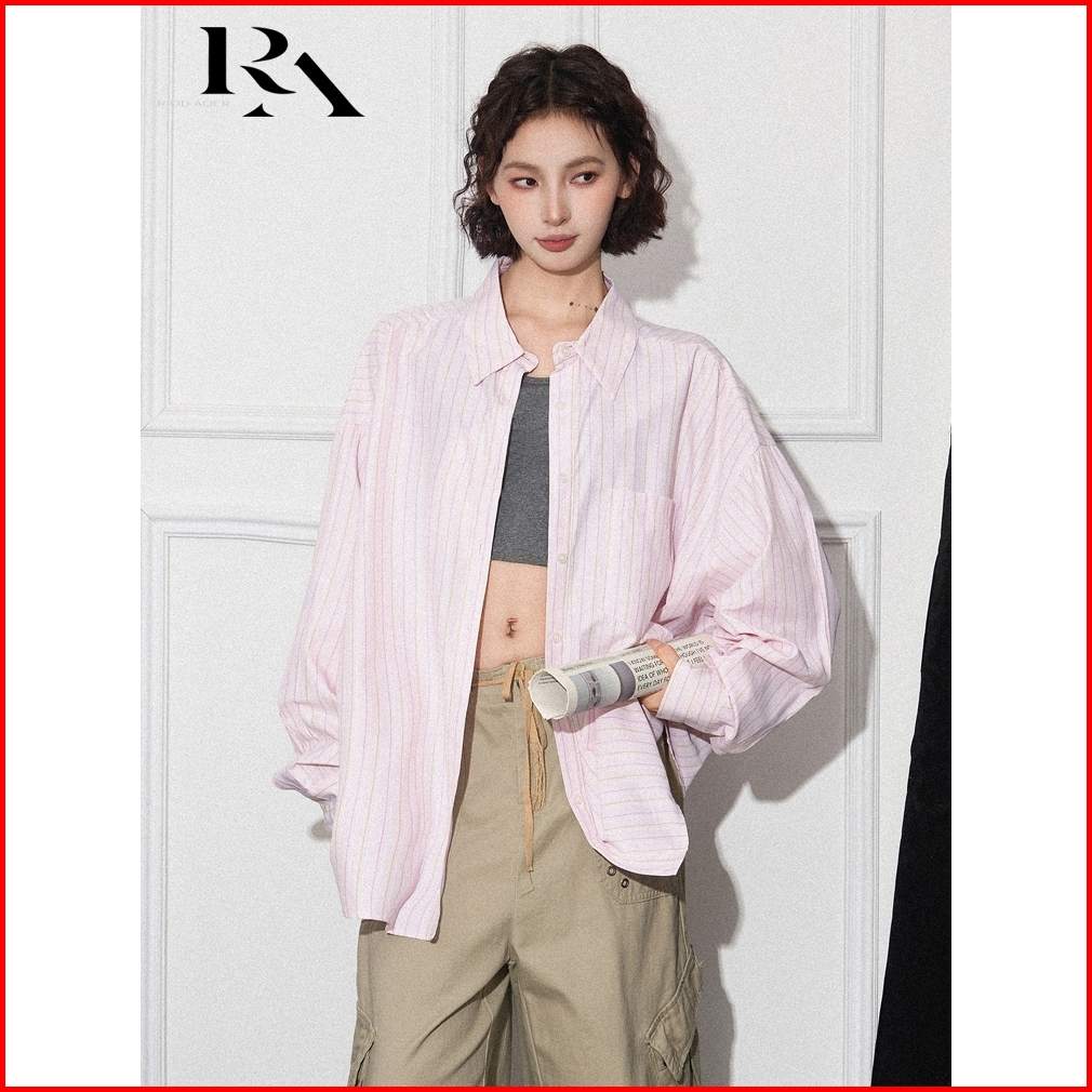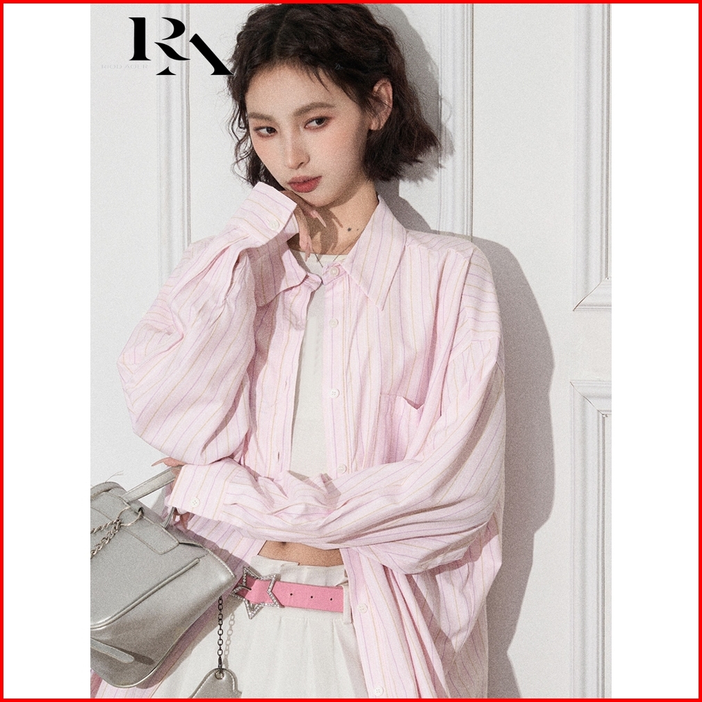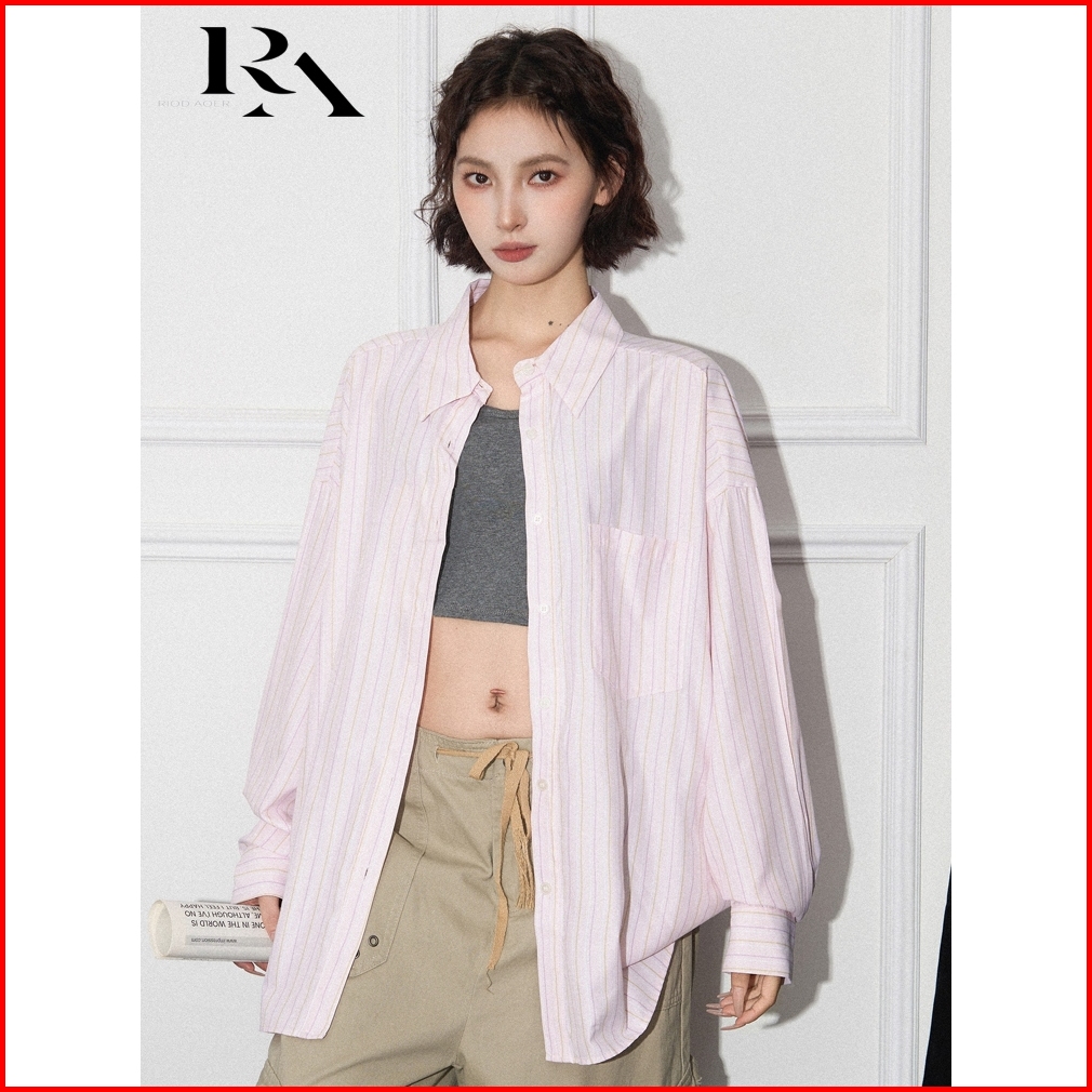 Riod Aoer Kemeja Bergaris Merah Muda Wanita Musim Baju Atasan Wanita Terbaru Semi Dan Musim Gugur Baru Longgar Serbaguna