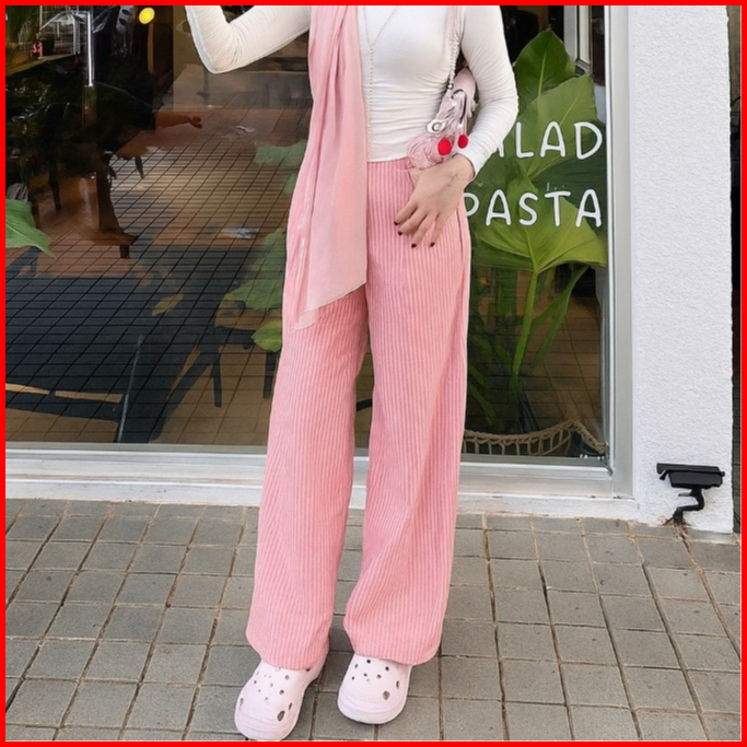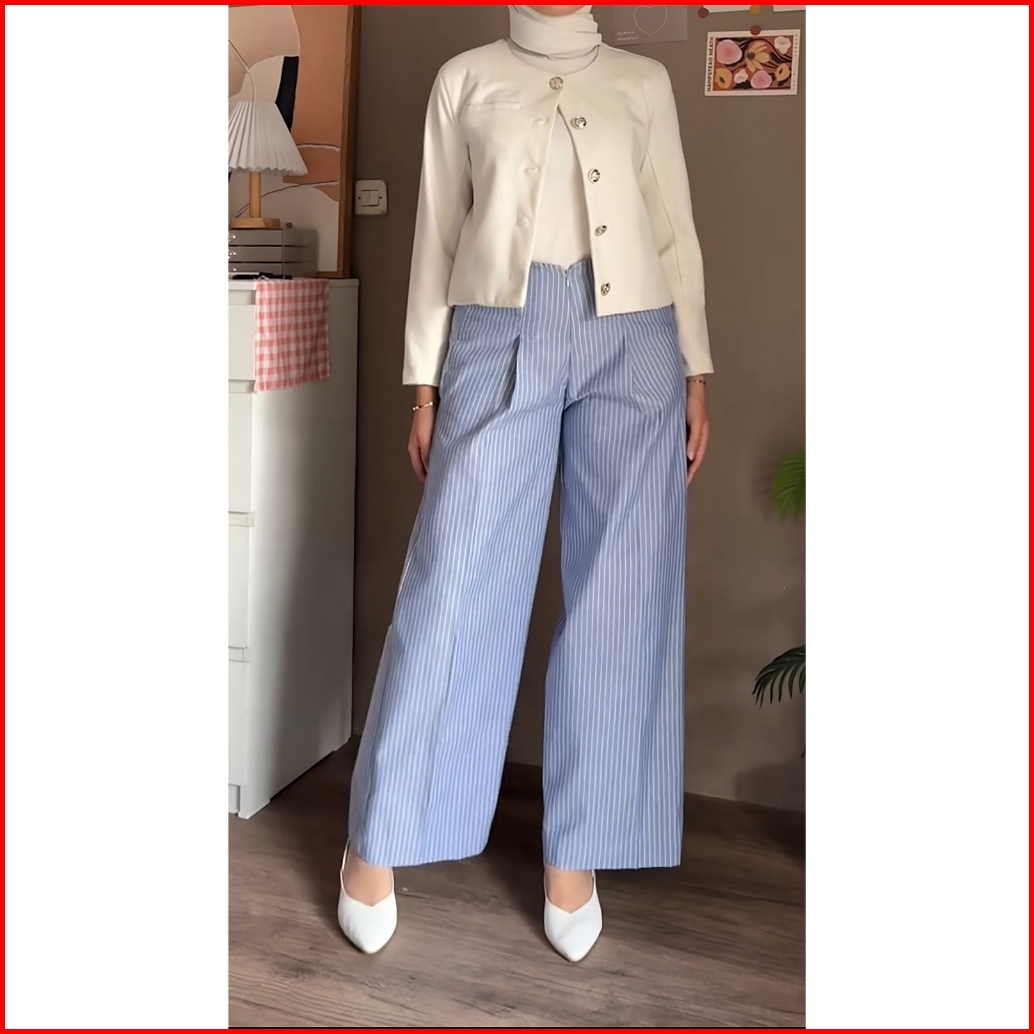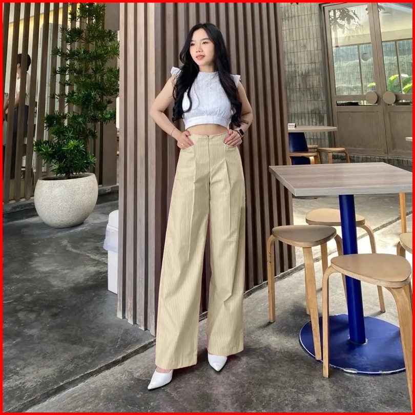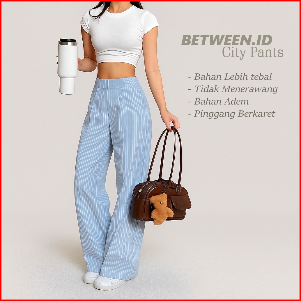 Betweeen - Stripe Pants Celana Panjang Wanita Wideleg City Pants Motif Salur Belakang Karet Celana Kulot Celana Kerja Ha