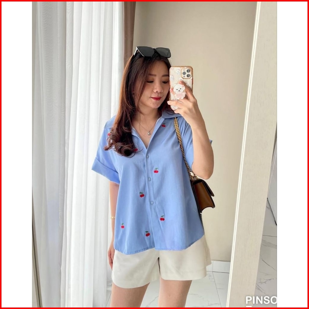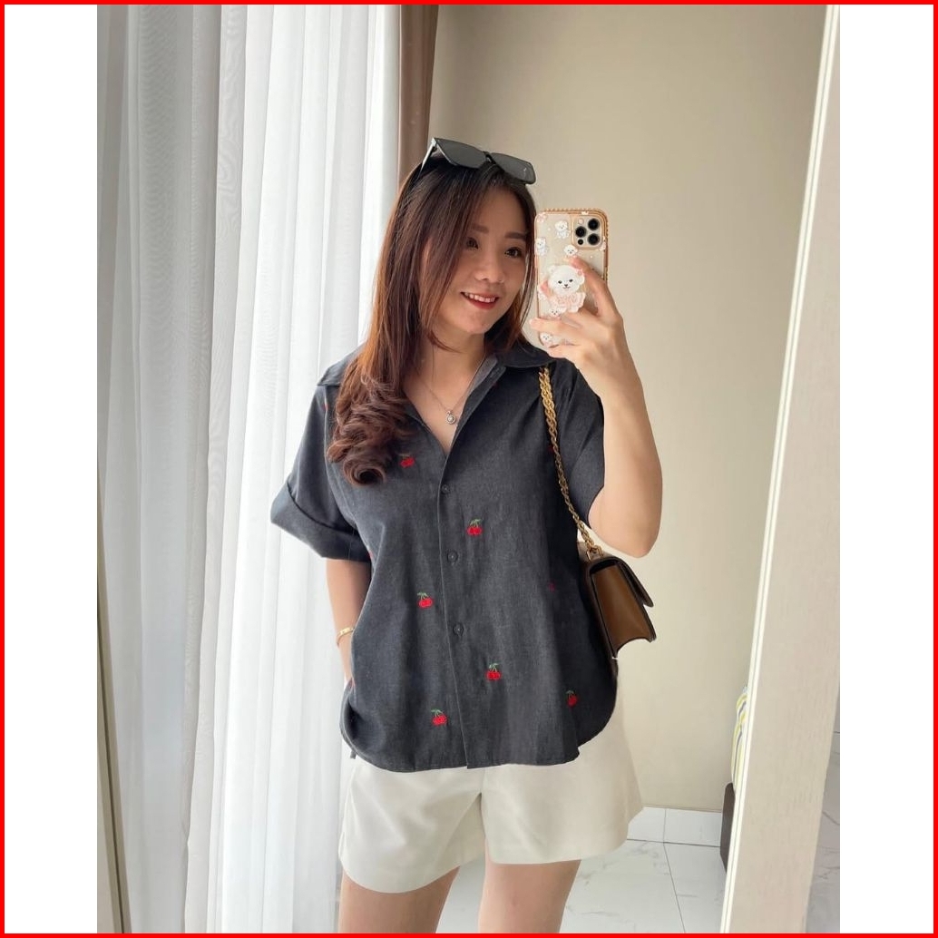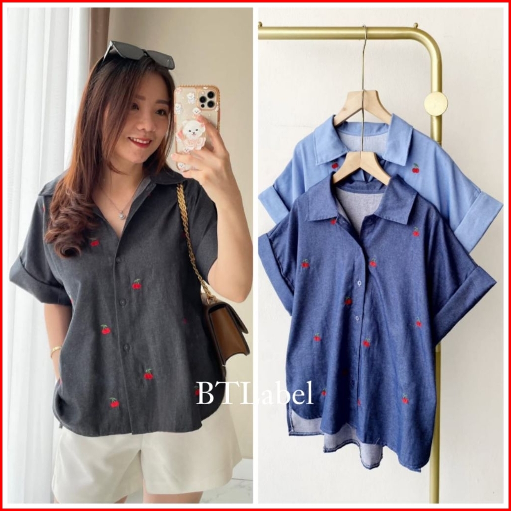 Btl Kemeja Denim Bordir Cherry Kemeja Wanita Kemeja Lengan Pendek