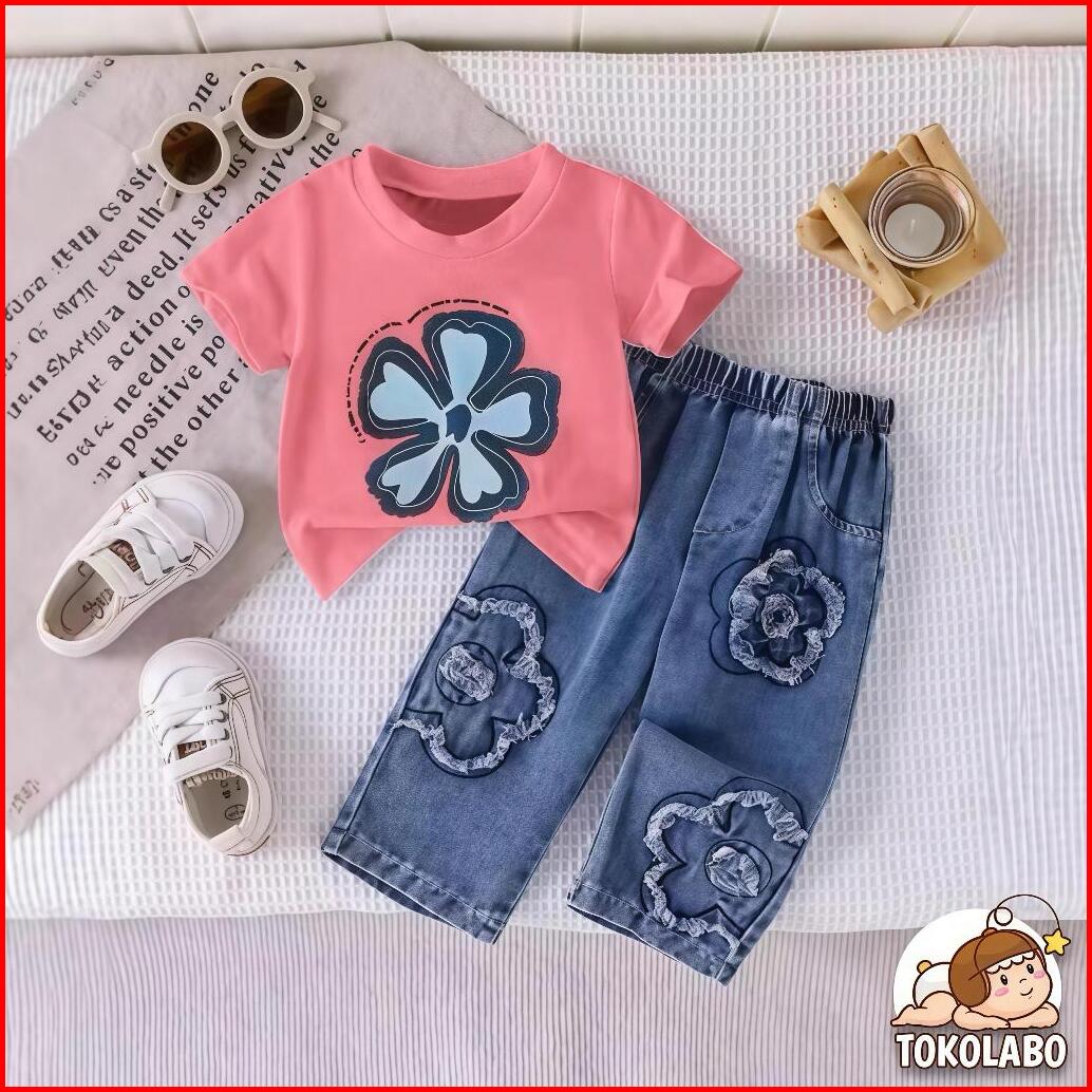 Tokolabo - Setelan Anak Perempuan Kekinian Motif Bunga Bordir 1-5 Tahun Kaos Celana Jeans Panjang