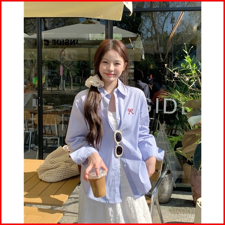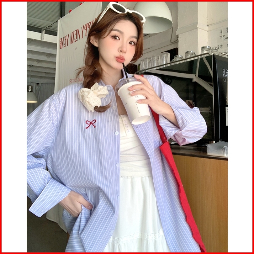 Yikoo - Kemeja Korea Bergaris Lengan Panjang Shirt Oversize Wanita Atasan