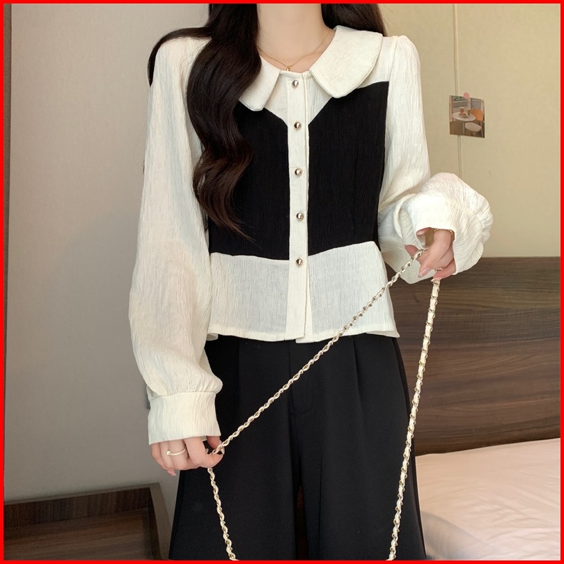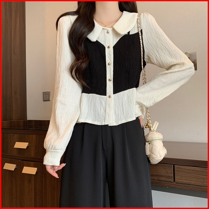 Yikoo-kemeja Wanita Atasan Patchwork Gaya Dua Potong Lengan Panjang Korea Shirt