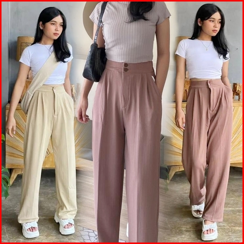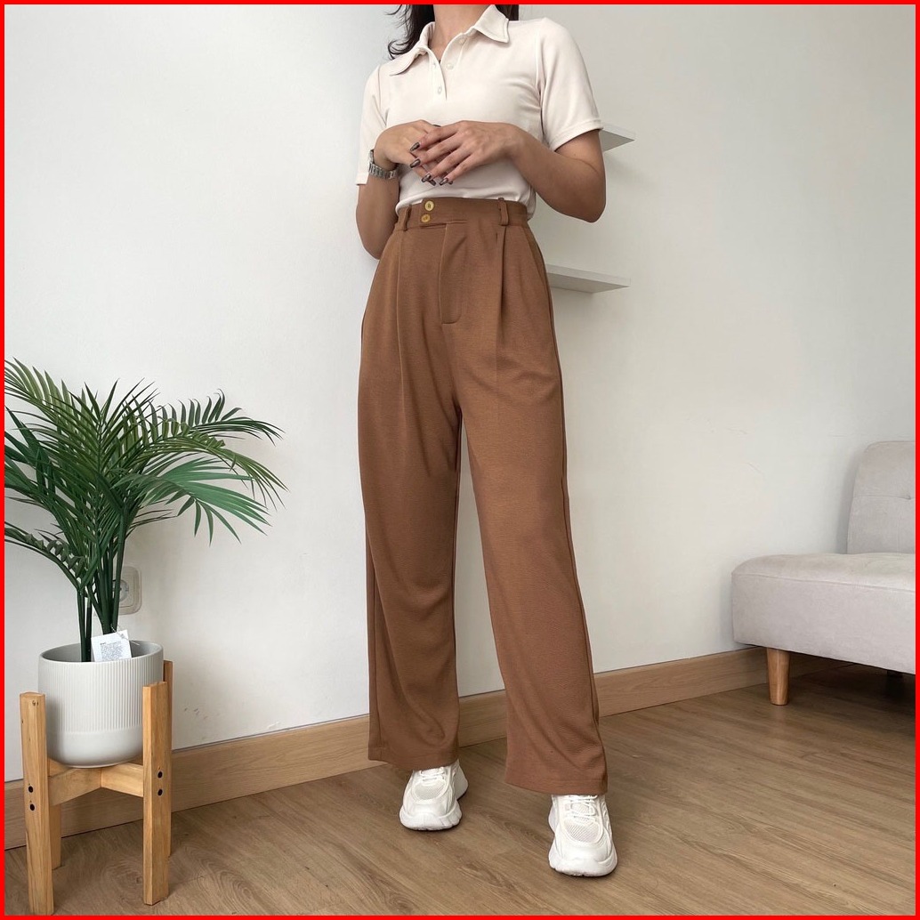 Celana Highwaist Loose Pants Trousers Celana Kerja Wanita Kantor Anti Kusut - Celana Kulot Wanita