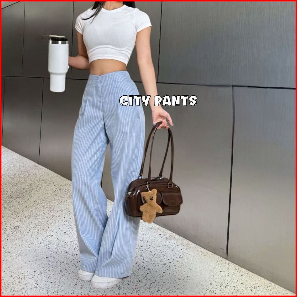 City Pants - Celana Tidur Panjang Wanita Kantor Kuliah Motif Garis Kulot Pinstripe Karet Lembut Loose Nf
