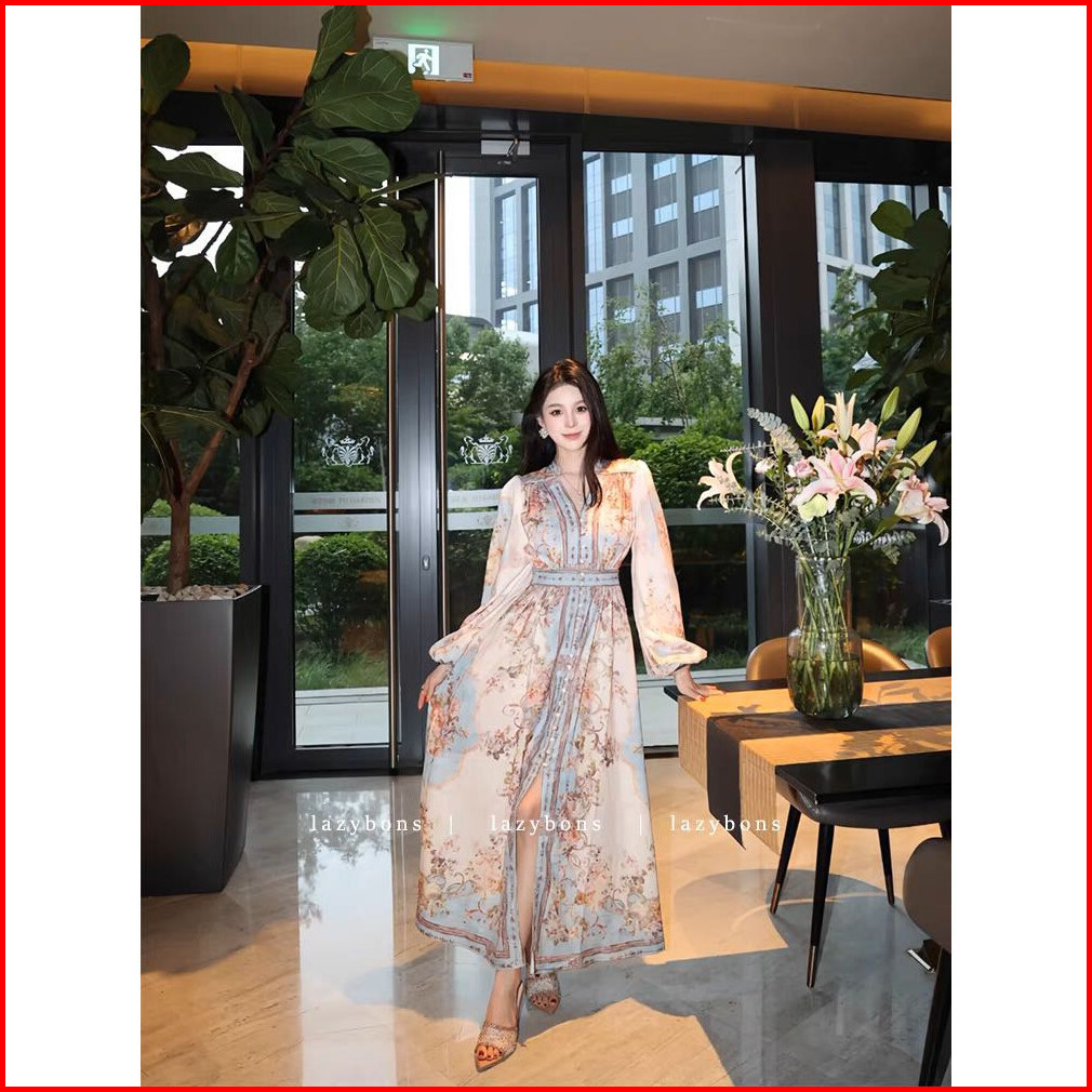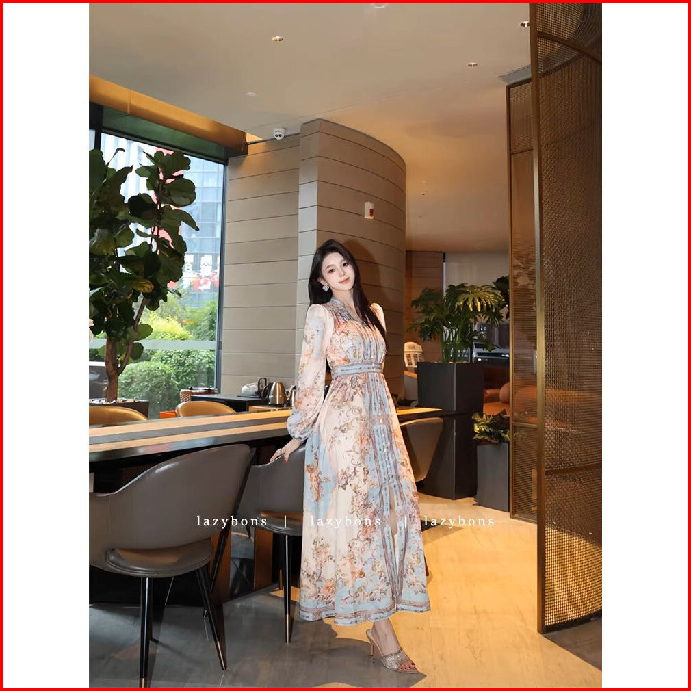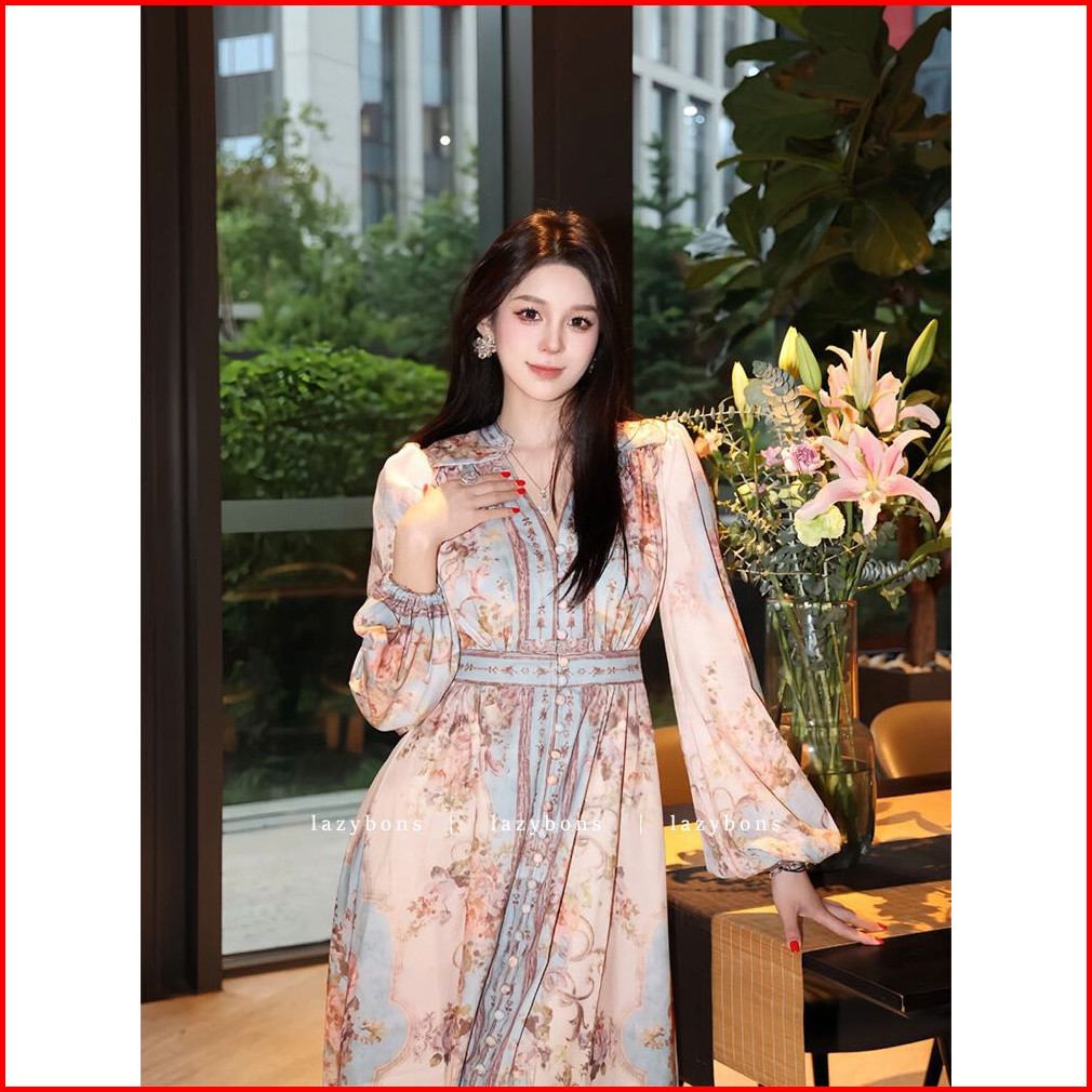 Ready Stock Fadfad Gaun Panjang Wanita Elegan Motif Bunga Vintage Lengan Panjang Anggun Bahan Ringan Nyaman Ukuran S-4xl