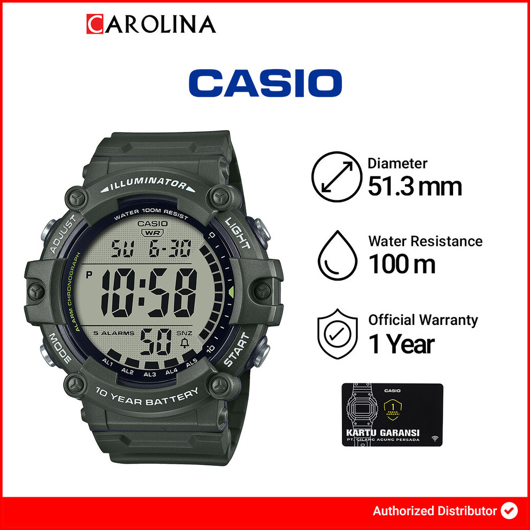 Jam Tangan Pria Casio General Ae-1500whx-3a Illuminator Digital Dial Extra Long Army Green Resin Band