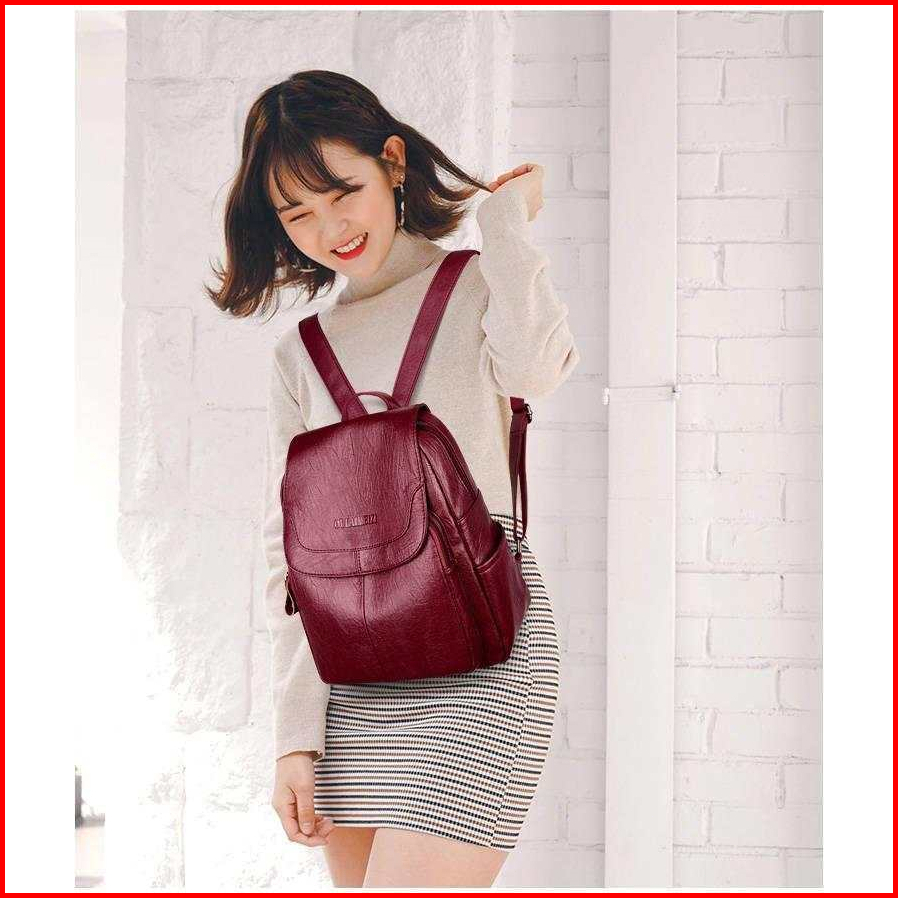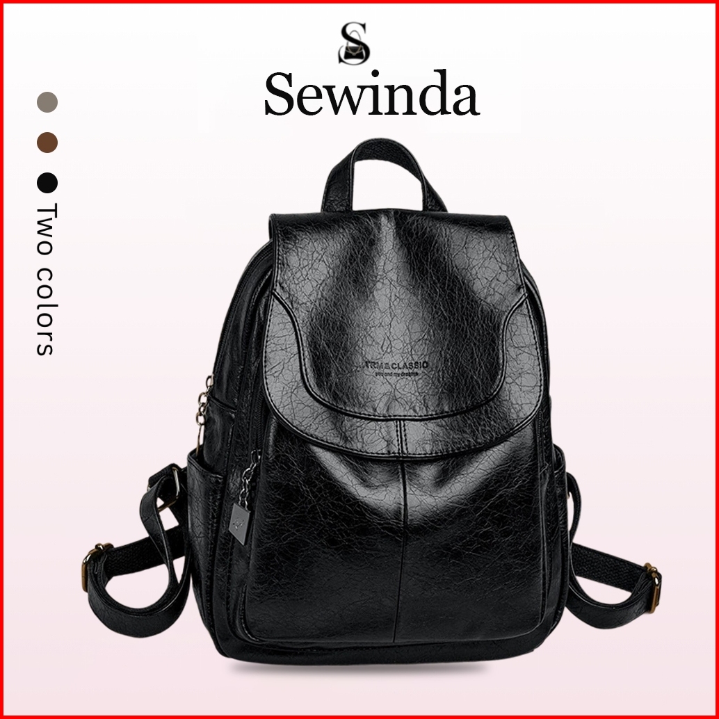 Sewinda Tas Ransel Wanita Fashion Kulit Pu Merah Coklat Retro Sederhana Tahan Aus