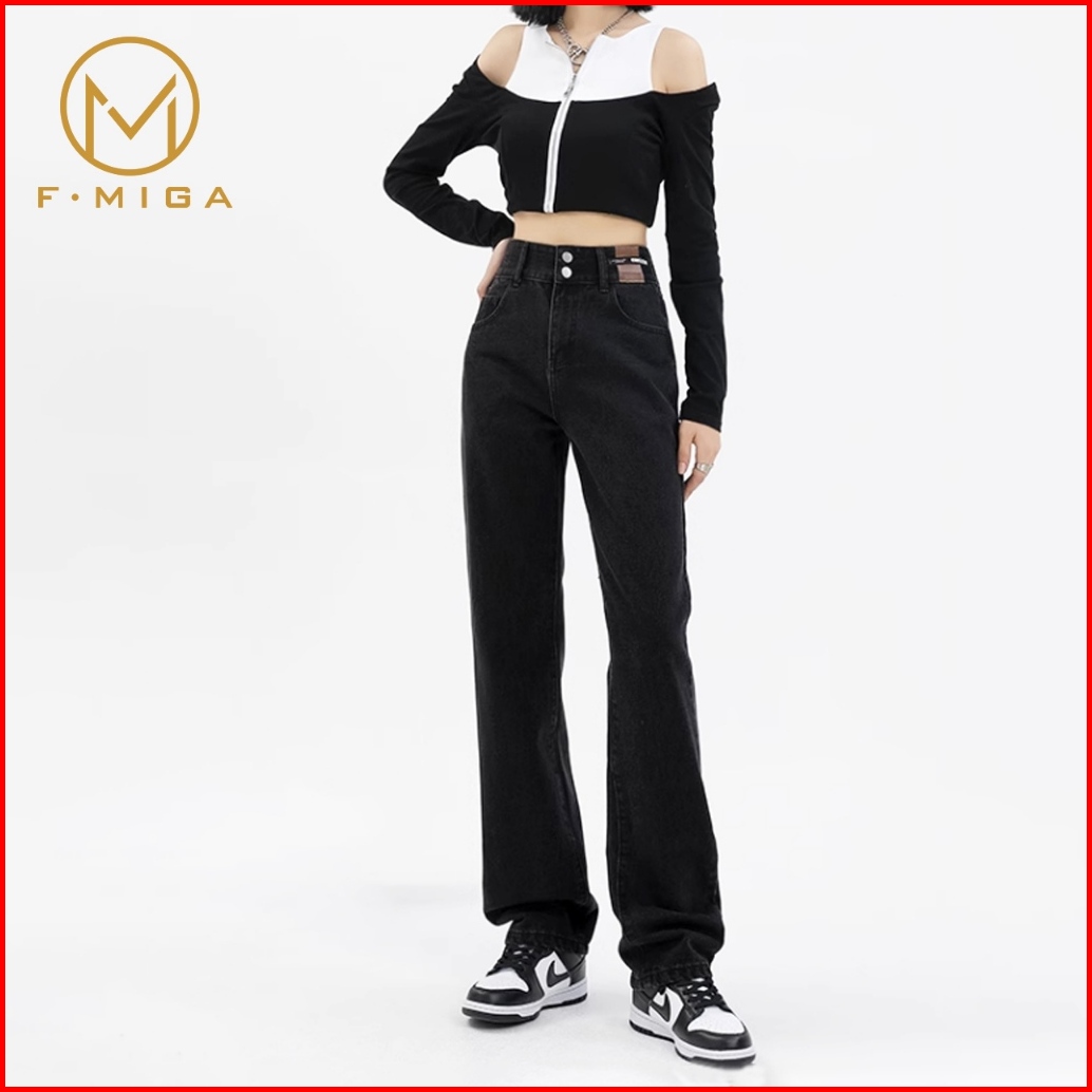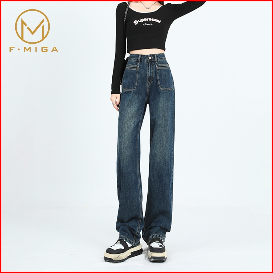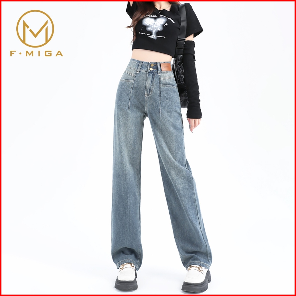 F Miga C156 Highwaist Korean Straight Bagy Stretch Jeans Celana Panjang Denim Wanita - Biru