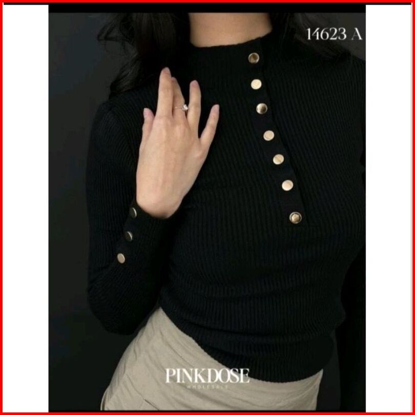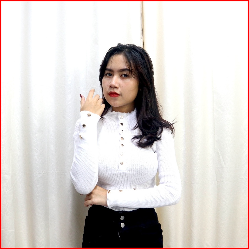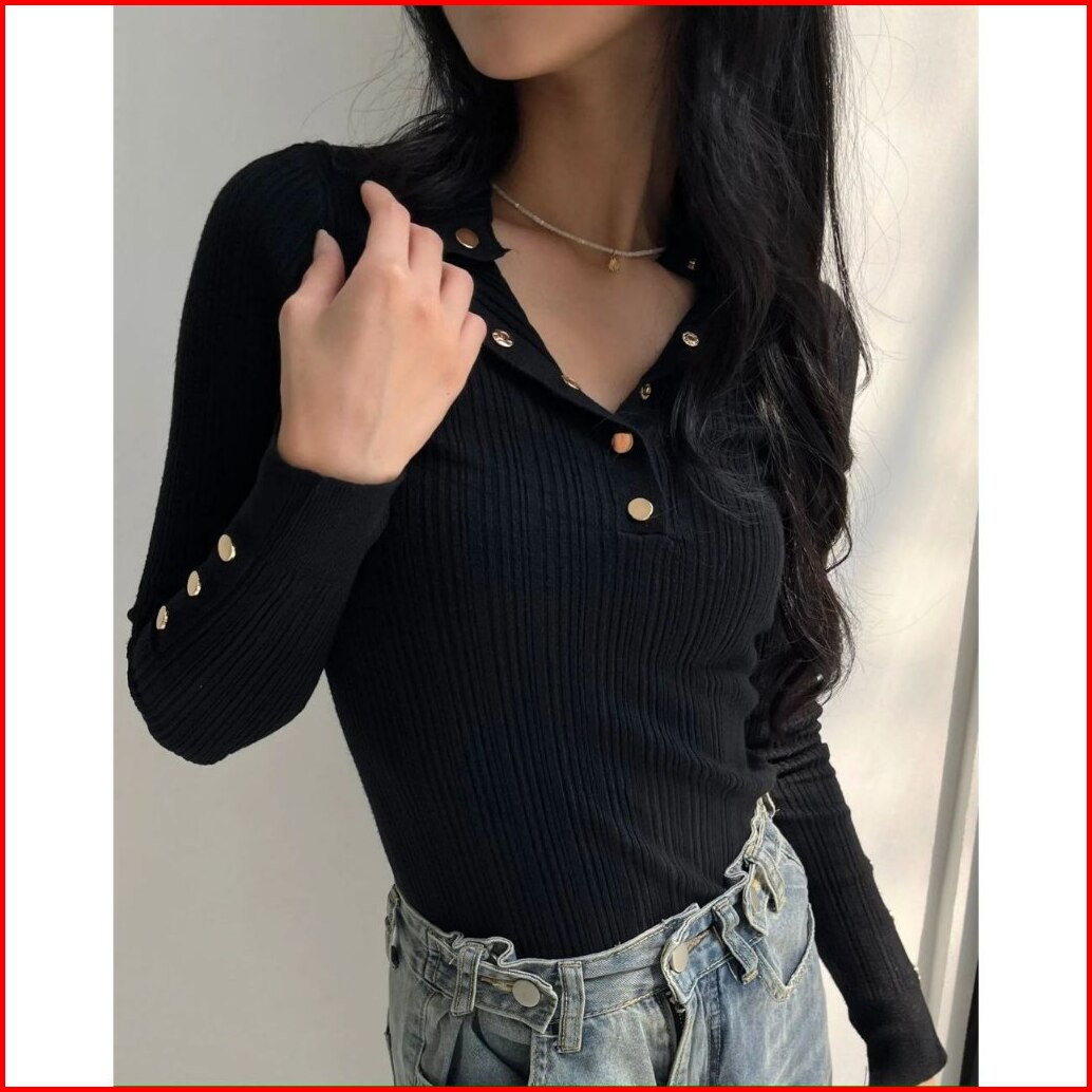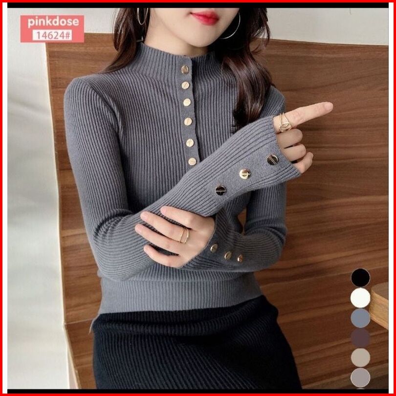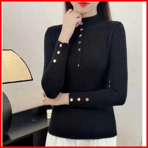 Atasan Rajut Wanita Button Knit Kaos Kerah Tinggi Variasi Kancing Aktif Inner Rajut Style Korea