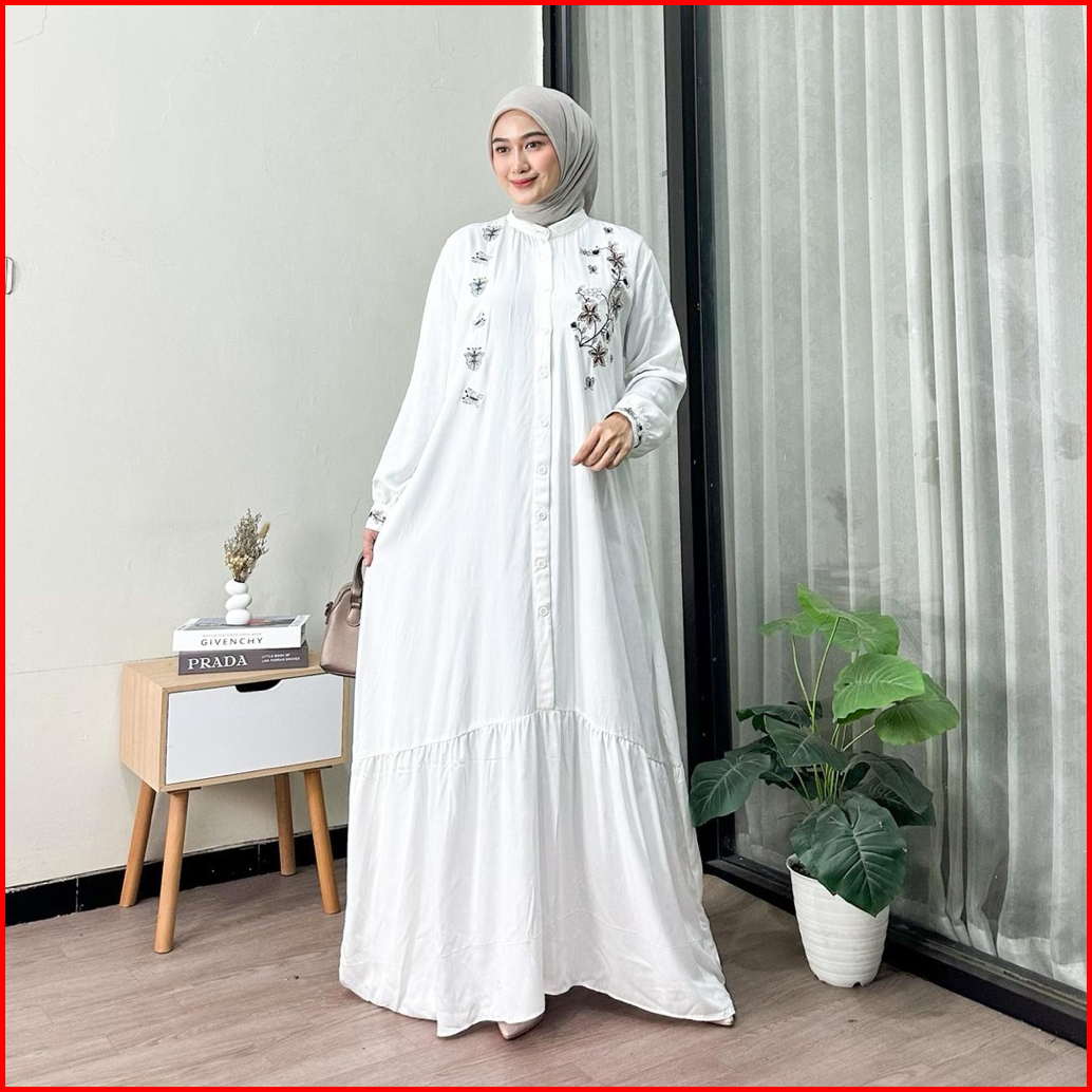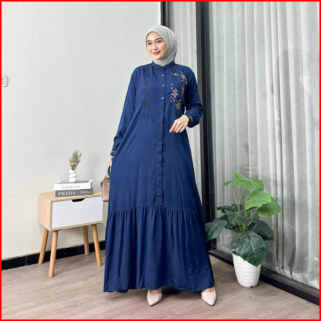 Arni Busana - Moza Maxi Dress Muslim Wanita Bordir Gamis Rayon Twill Premium Full Kancing