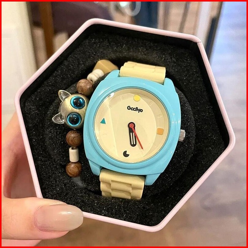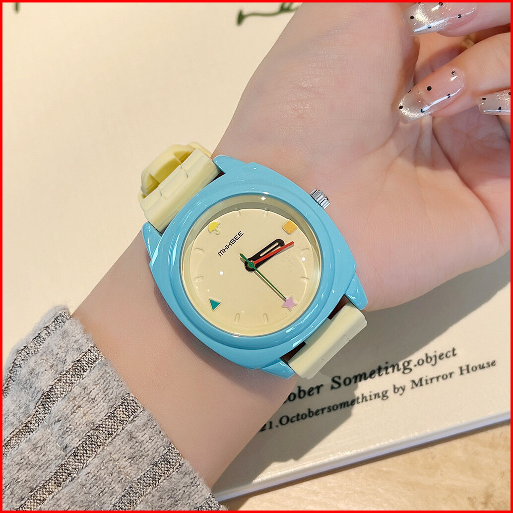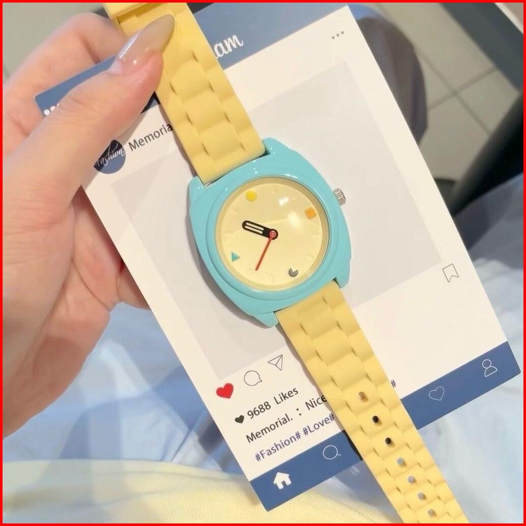 Jam Tangan Kuarsa Wanita Lucu Warna Permen Dial Persegi Tali Silikon Jam Tangan Santai