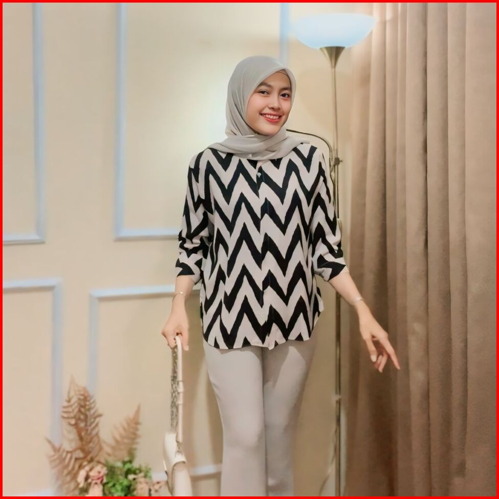 Kemeja Wanita Atasan Rayon Motif Zigzag Lengan 3 4 Terbaru 2024