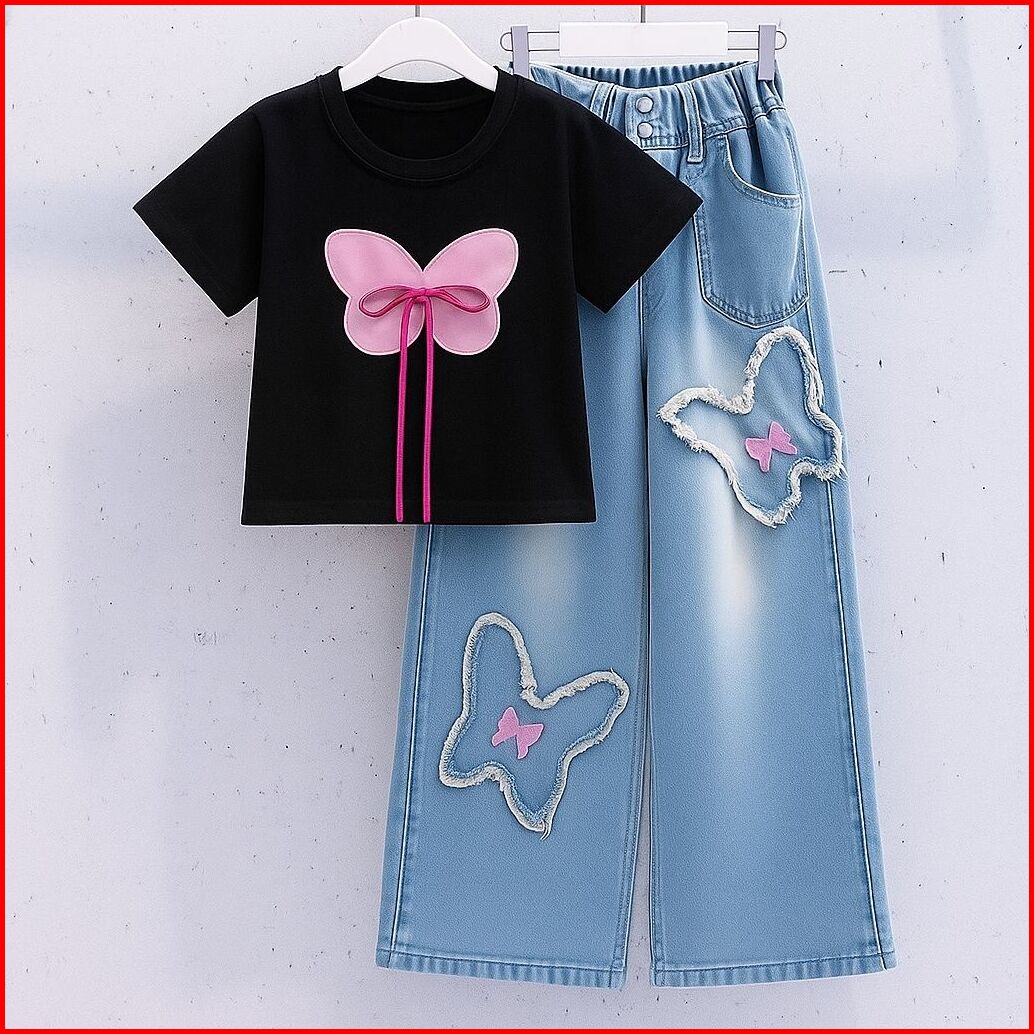 Setelan Anak Perempuan Kekinian Bahan Katun Dengan Celana Denim Panjang Motif Kupu Pita Usia 6 Bulan - 5 Tahun