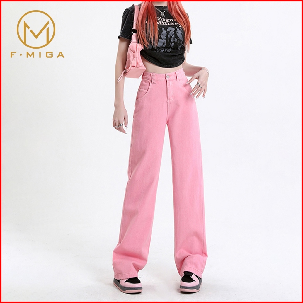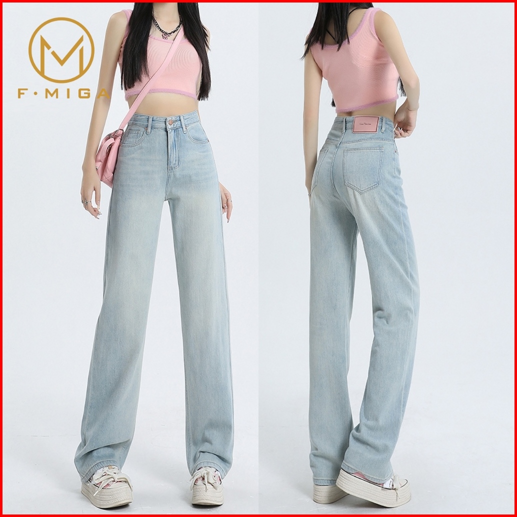 F Miga C128 Korean Style High Waist Bagy Celana Jeans Straight Kasual Wanita - Cokelat