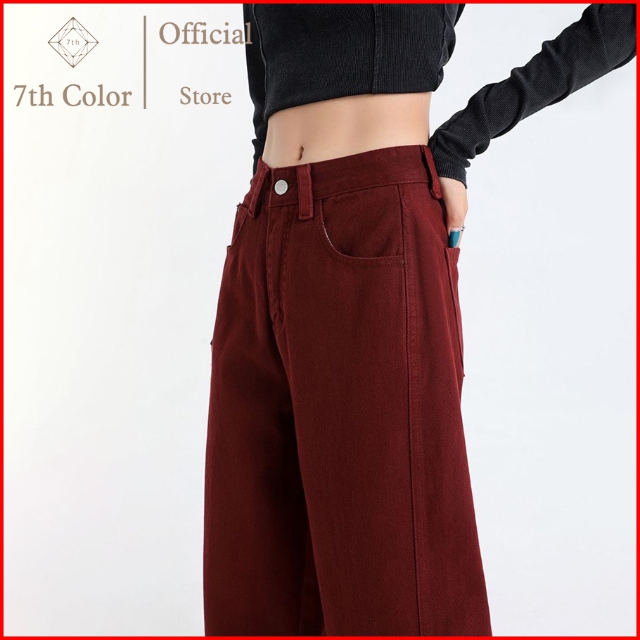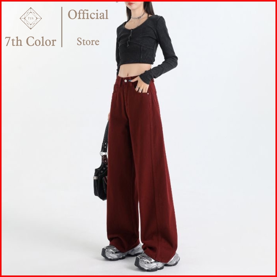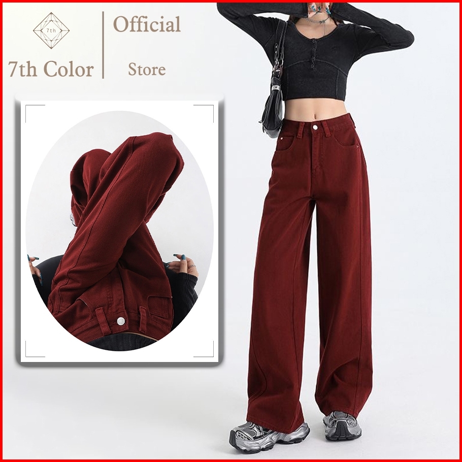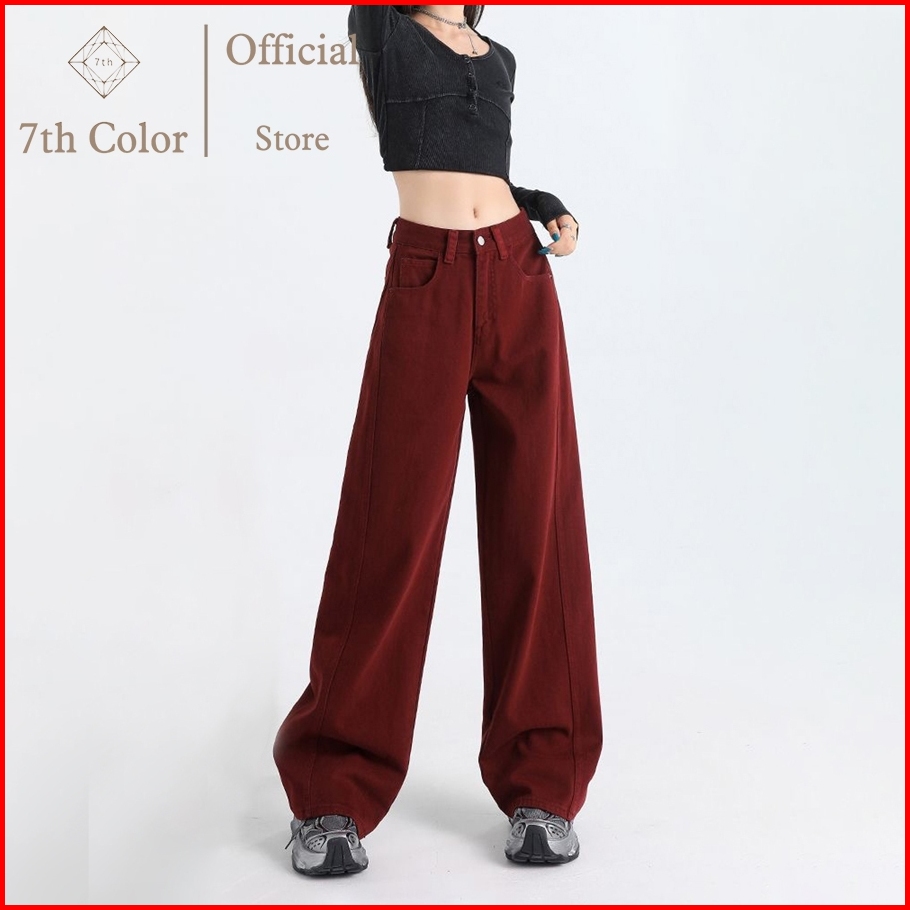 7th Color Celana Denim Merah Tua Model Pinggang Tinggi Lurus Loose Fit Ootd