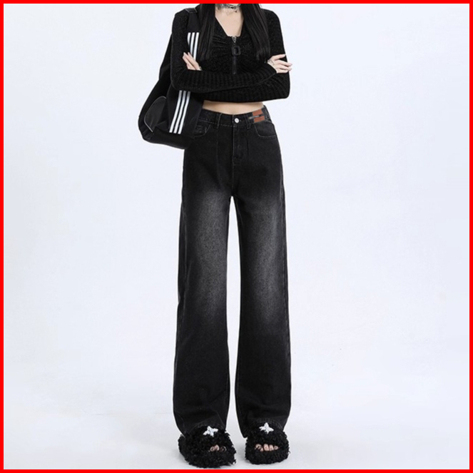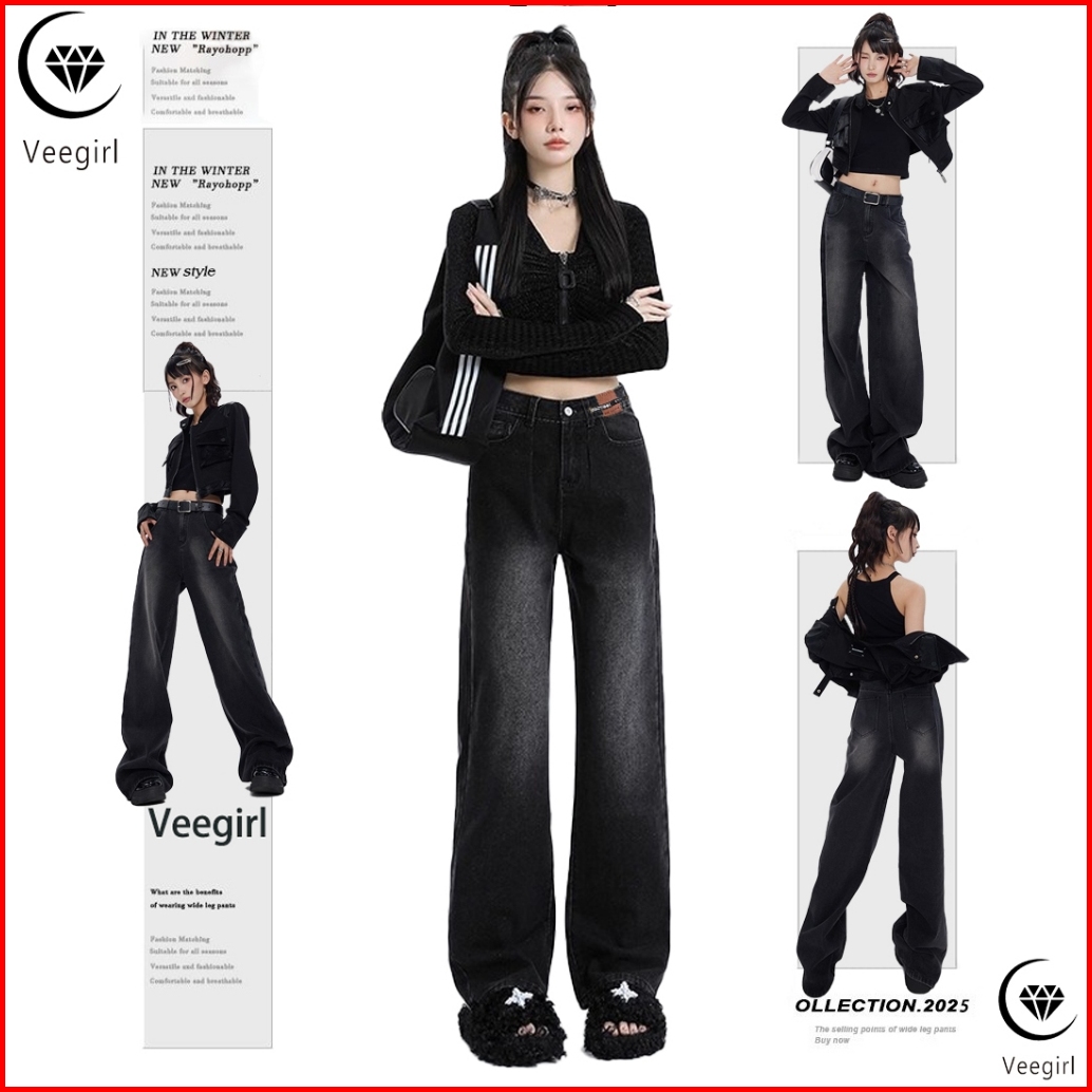 Veegirl Celana Jeans Wanita High Waist Wide Leg Longgar Vintage Straight Korean Streetwear