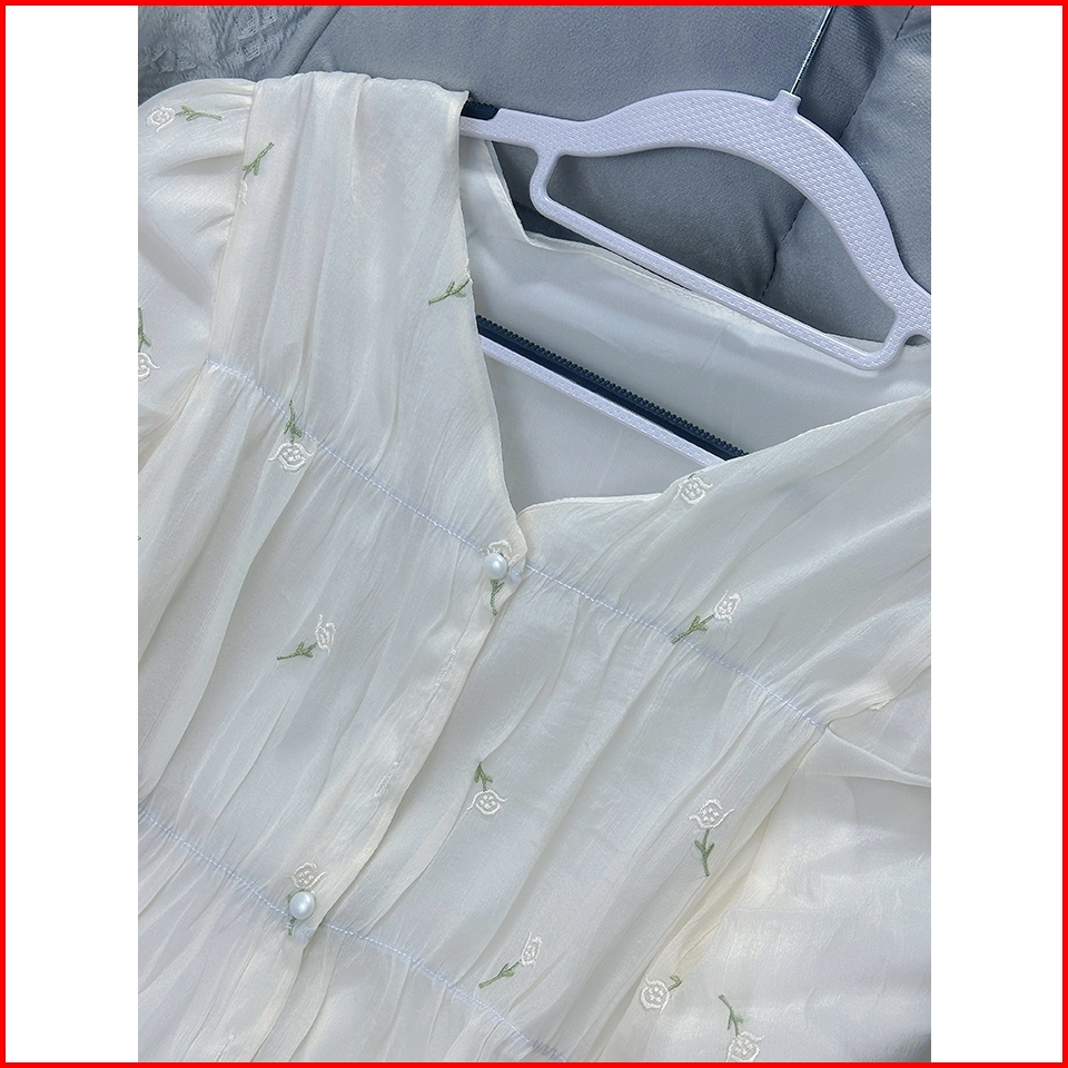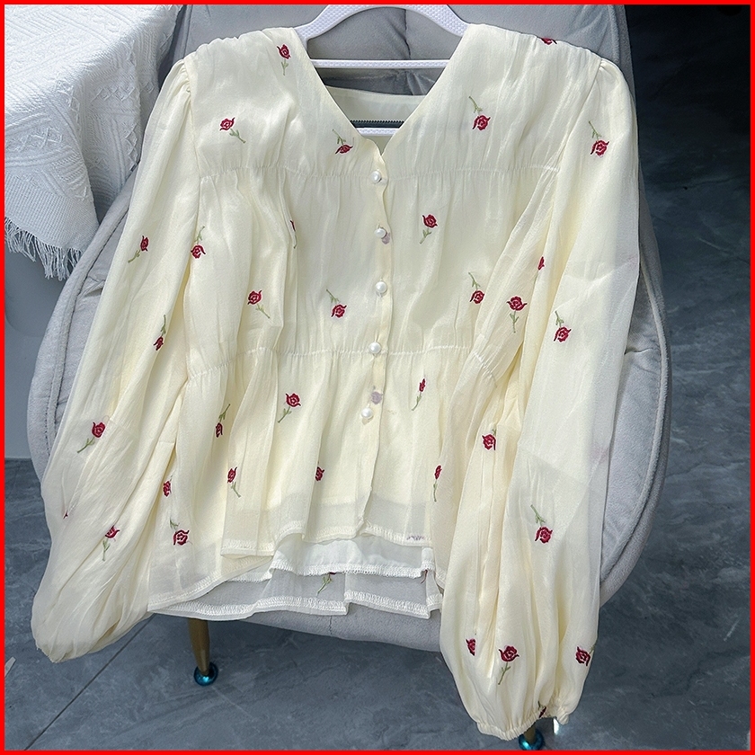 Blus Sifon Lengan Panjang Gaya Retro Baju Istana Bordir Pinggang Lentera Lengan Kemeja