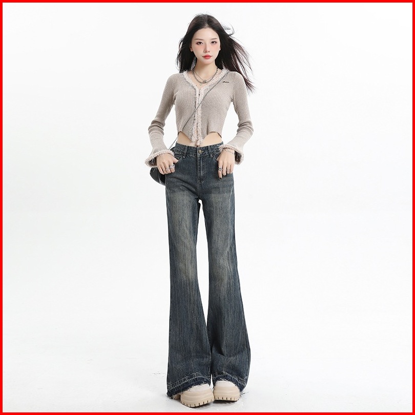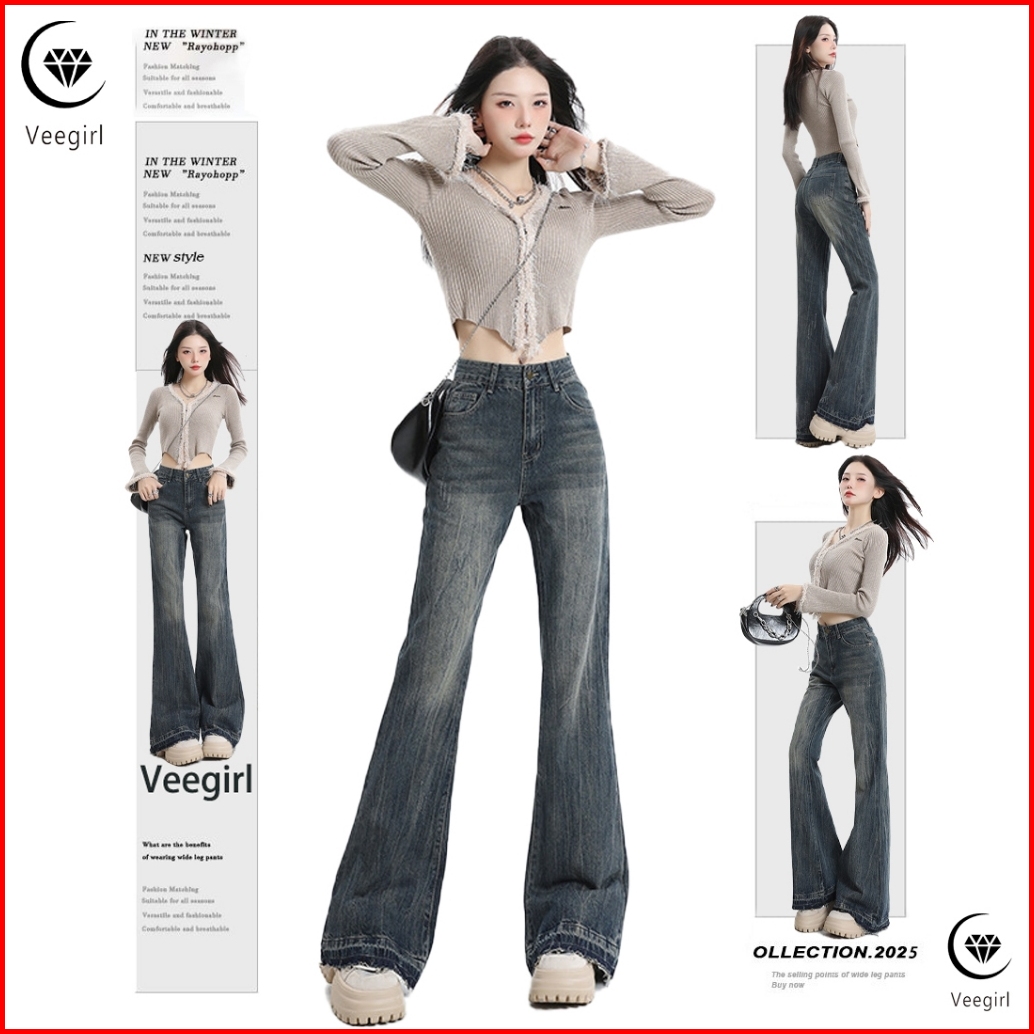 Veegirl Celana Jeans Wanita High Waist Flare Pants Cutbray Denim Korean Style Slim Fit Vintage Panjang