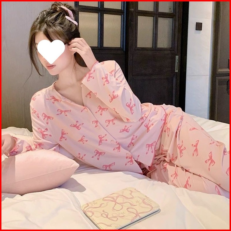 Piyama Wanita Pink Set Bs-5077 Baju Tidur Ice Silk V-neck Lembut Lengan Panjang Celana Panjang Kancing Depan Sleepwear M