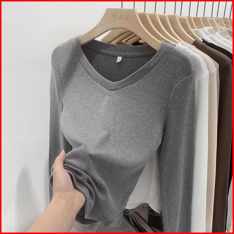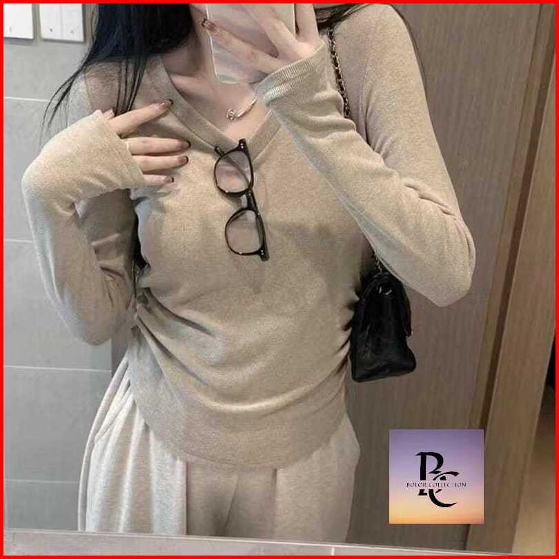 Atasan Wanita Rib Knit Lengan Panjang V-neck Kasual Korean Style