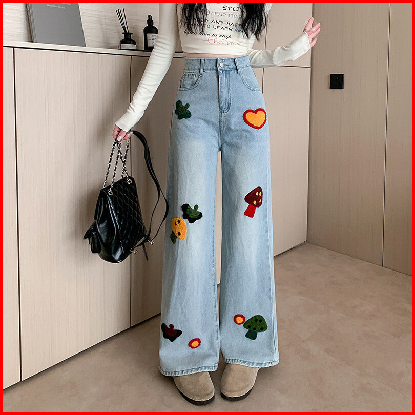 Yuruma Jeans Wide Leg Korean Style Dengan Embroidery Tumbuhan High Waist Longgar Untuk Gaya Kasual