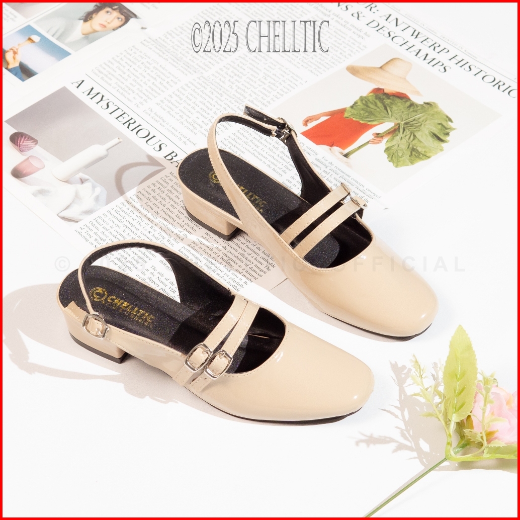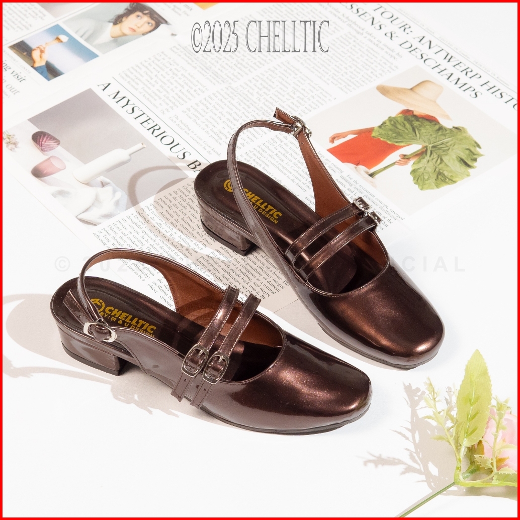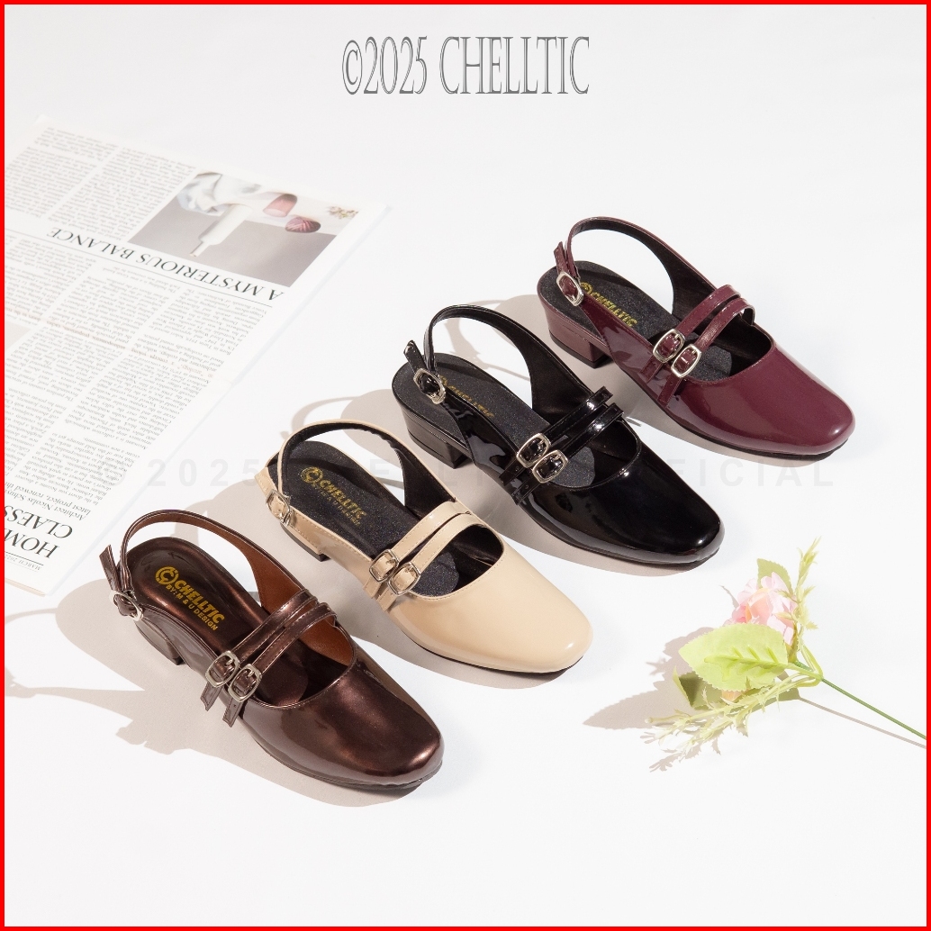 Mules Wanita Heels 3cm Sepatu Selop Slip On Tali Gesper Vintage Glosy
