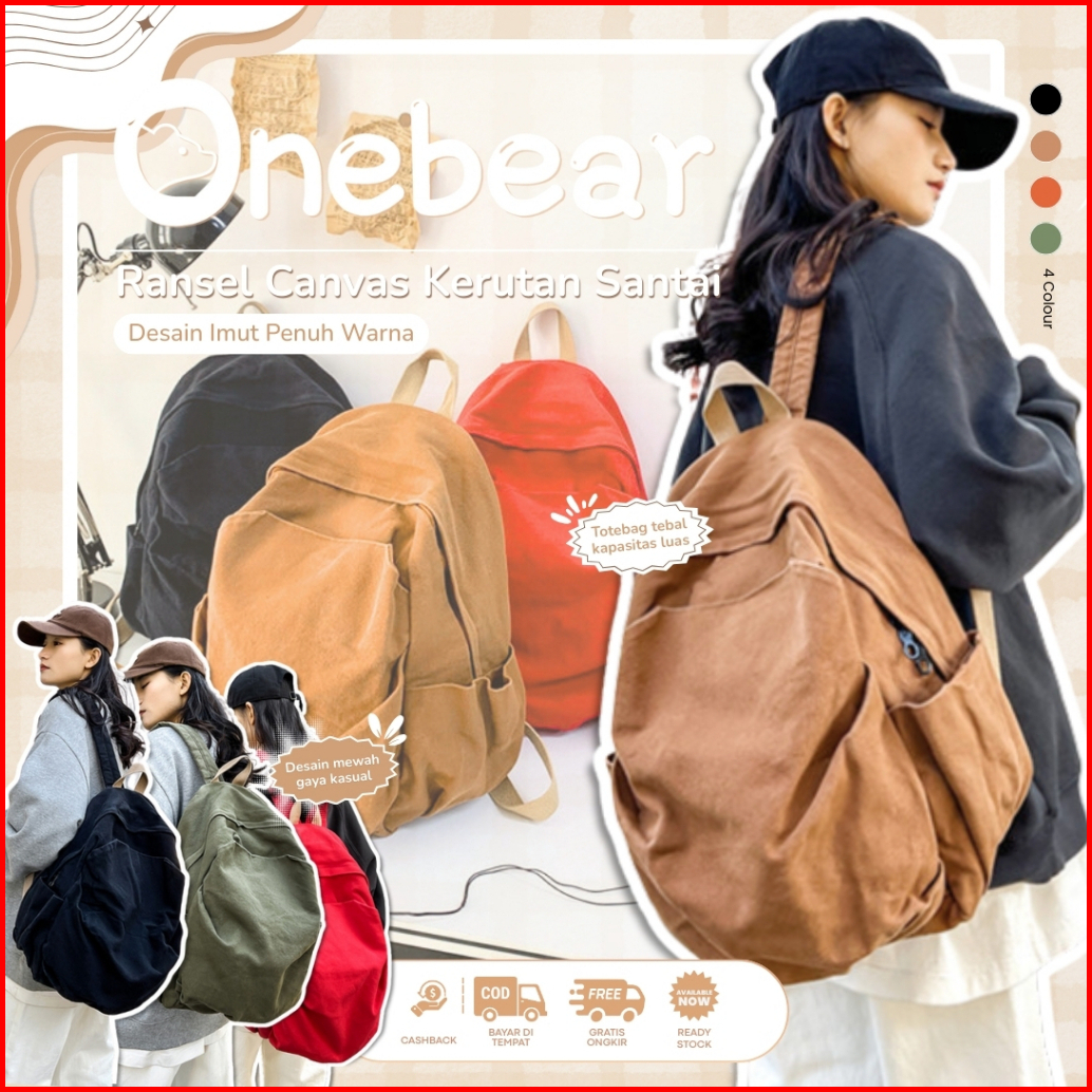 Onebear Ransel Kanvas Tas Sekolah Wanita Dengan Gaya Jepang Desain Berkerut Yang Mini Terbuat Dari Kanvas Yang Dicuci Ai