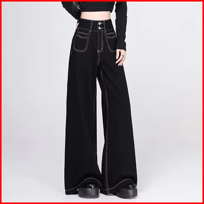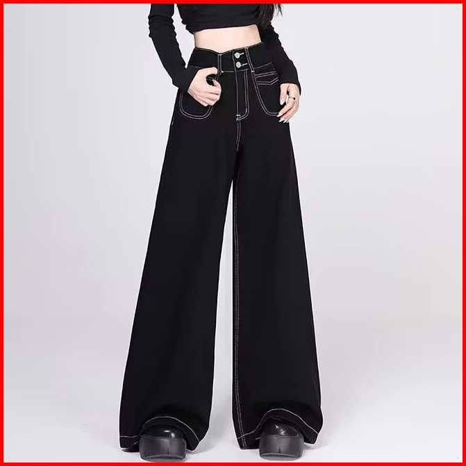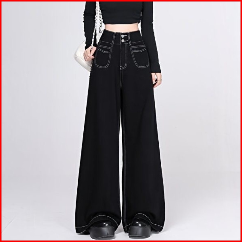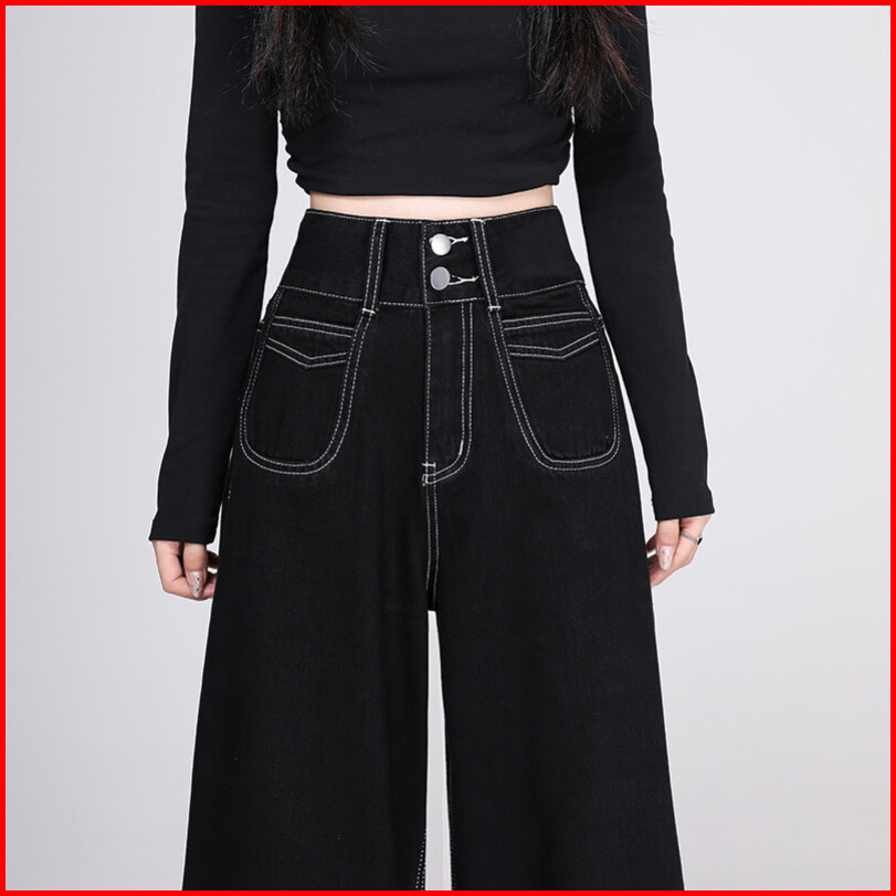 Yuruma Celana Jeans Wanita Korean Ukuran Besar S-7xl Pinggang Tinggi Kancing Ganda Wide Leg - Model Kasual