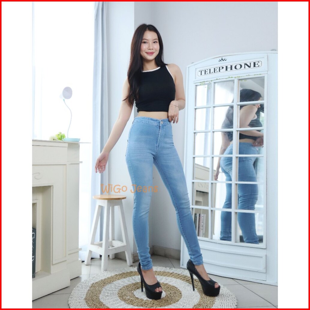 Highwaist Jeans Premium Celana Panjang Wanita Skinny Stretch Biru Muda Size 27 - 34