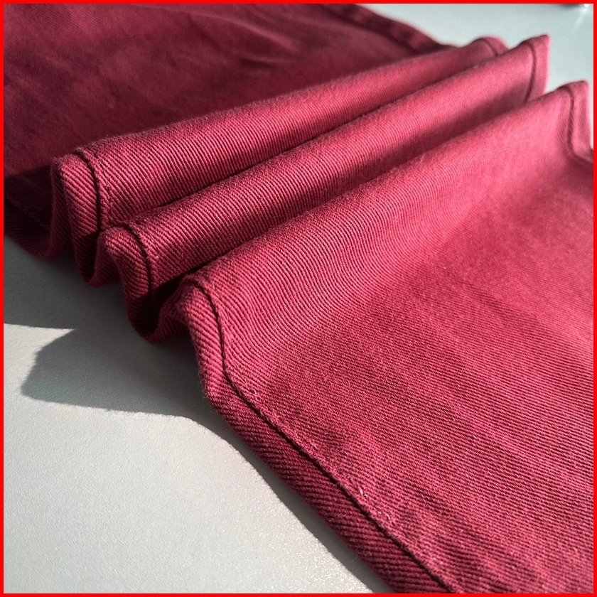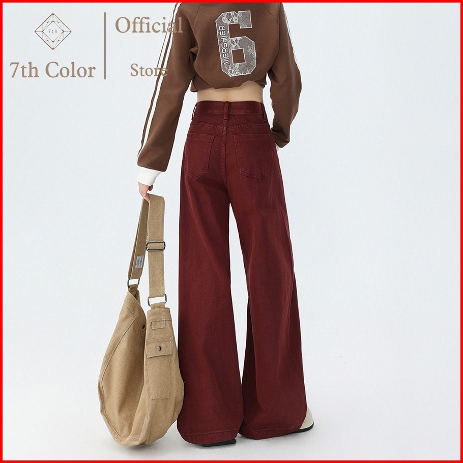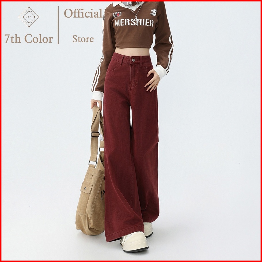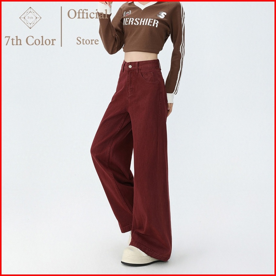 7th Color Celana Denim Merah Tua Model Pinggang Tinggi Lurus Loose Fit Ootd