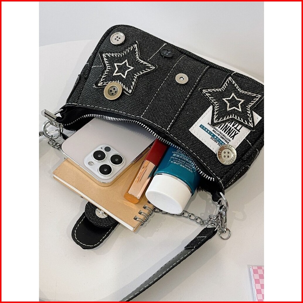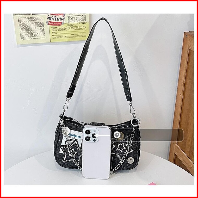 Tas Bahu Tunggal Bintang Denim Terbaru Tren Fashion Desain Unik Tas Bulan Sabit Kanvas Tas Tangan Rantai Tas
