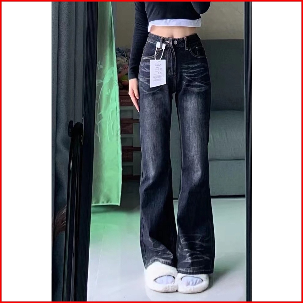 Forteid Jeans Hitam Retro Korean Stylecelana Model Lonceng Wanita Kekinian Celana Lurus Pinggang Tinggi Celana Lebar Kak