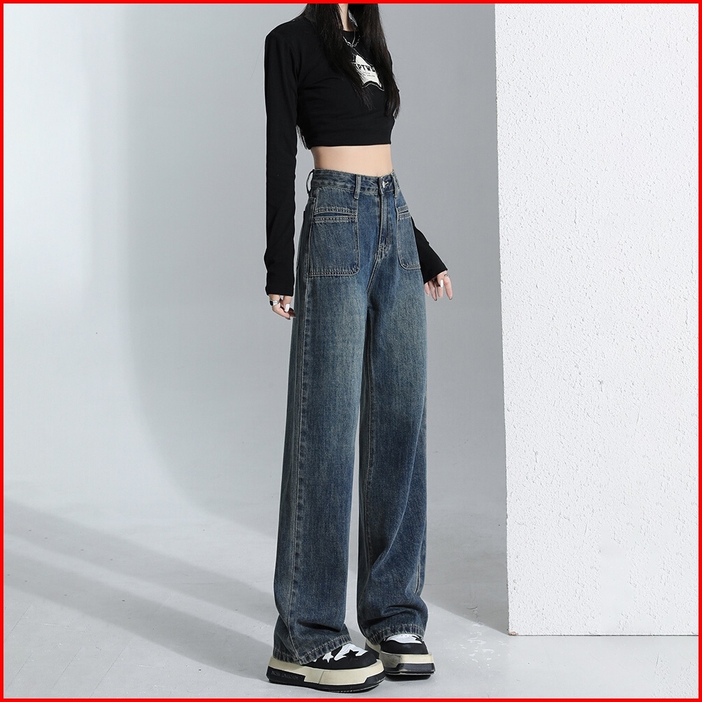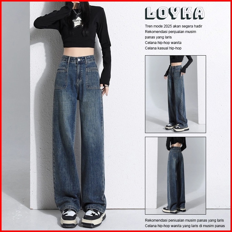 Loyka Celana Jeans Wanita Kaki Lebar Retro Amerika Untuk Wanita Celana Longgar Lurus Ramping Pinggang Tinggi 2025 Baru
