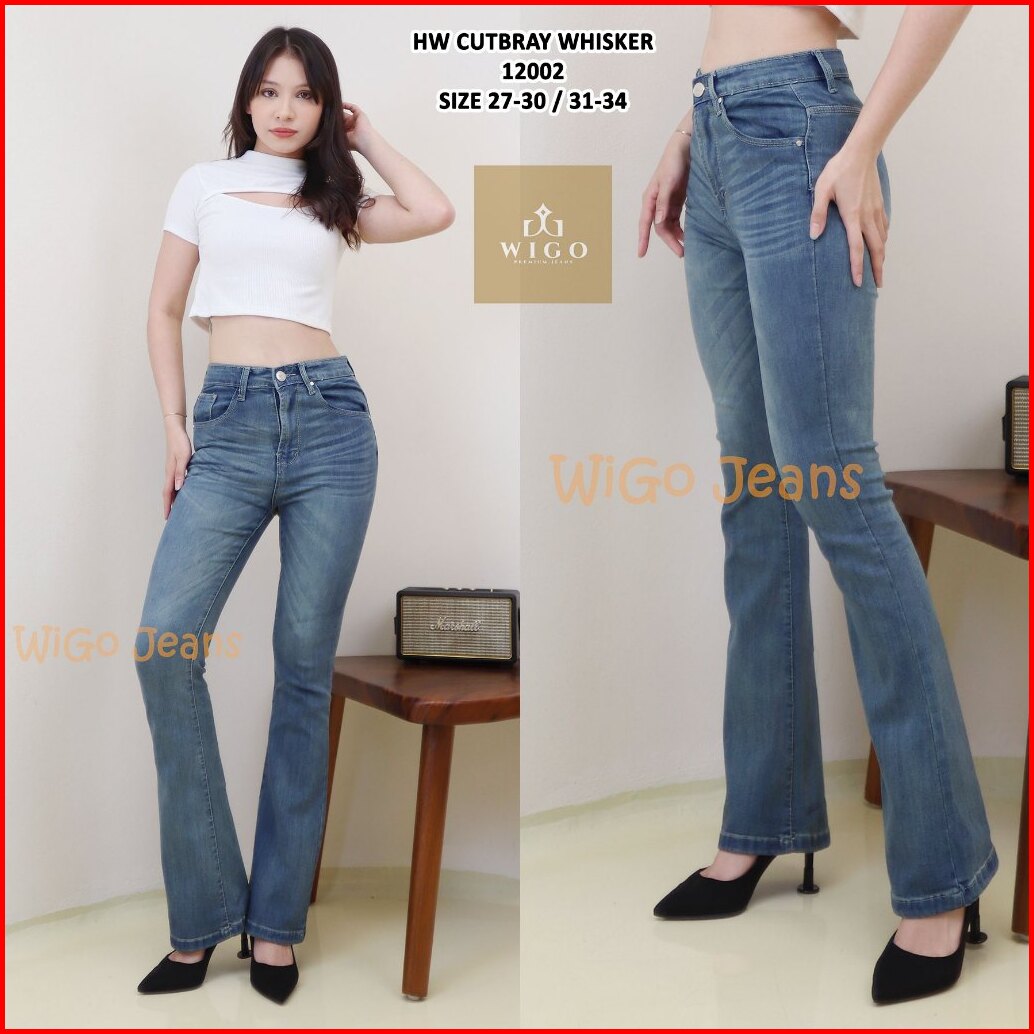 Celana Highwaist Cutbray Jeans Wanita Premium Strecth Whisker Biru Kehijauan Size 27-34 Fit Flare