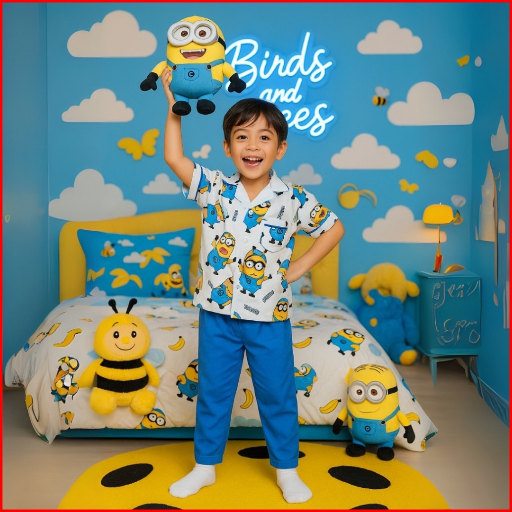 Birds And Bees Piyama Anak Laki-laki Print Minion Setelan Baju Tidur Katun Kombat Atasan Putih Full Print Lengan Pandek
