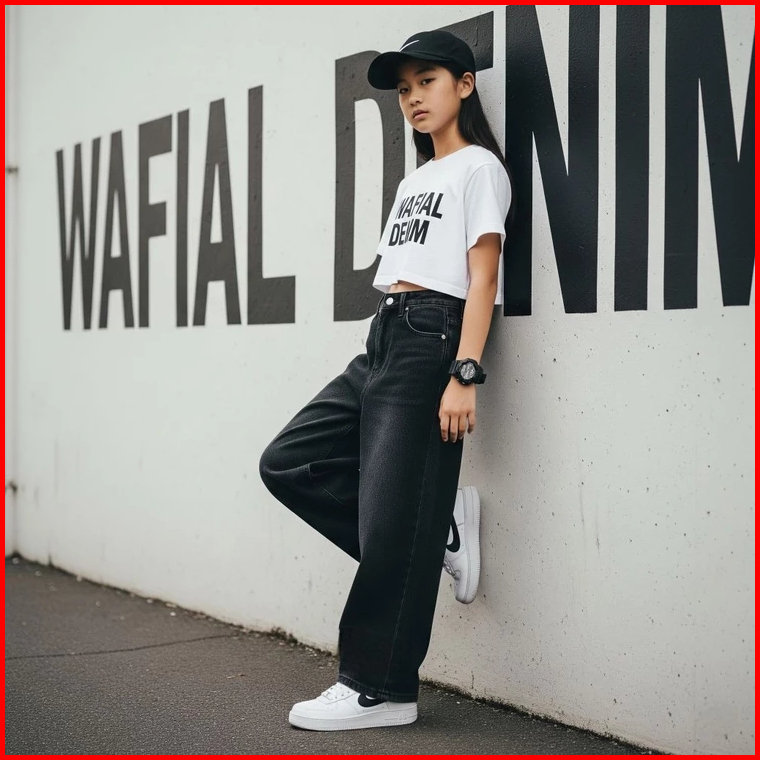 Celana Jeans Anak Remaja Loose Pants Longgar Gombrong Highwaist Hitam Retro Usia 9 - 14 Tahun