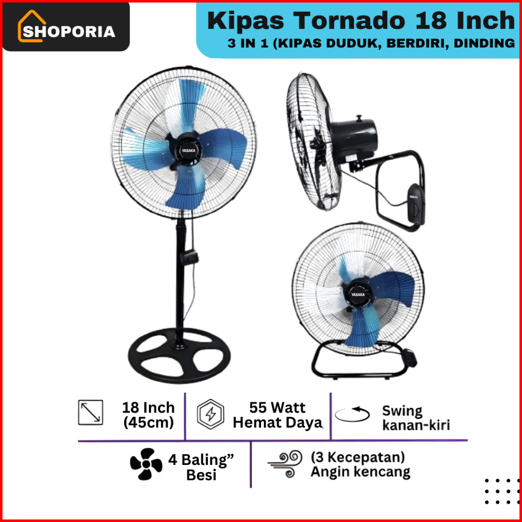 Yasaka Ya-1808 Kipas Angin Tornado Besi Duduk Dinding Berdiri Besar 18 Inch Fan