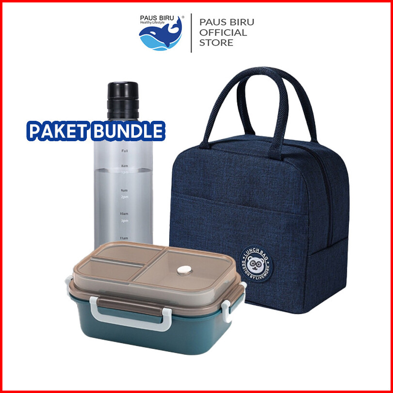 Paus Biru - 2in1 Kotak Tempat Makan Set 2 3 Sekat Anti Tumpah Lunch Box Susun Sendok Garpu Portable
