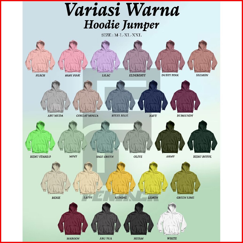 HITAM, PUTIH, Beige, SAGE GREEN, STEEL BLUE, ALDERBERRY, MINT, PEACH, Olive, Abu Tua, ABU MUDA, SALMON, DUSTY PINK, GREEN LIME, LEMON, HIJAU STABYLO, LATTE/CREAM, COKLAT MOCCA, MAROON, NAVY, LILAC/UNGU MUDA, ARMY, HIJAU BOTOL, RANDOM WARNA&DESIGN, WARNA LAIN DI NOTE