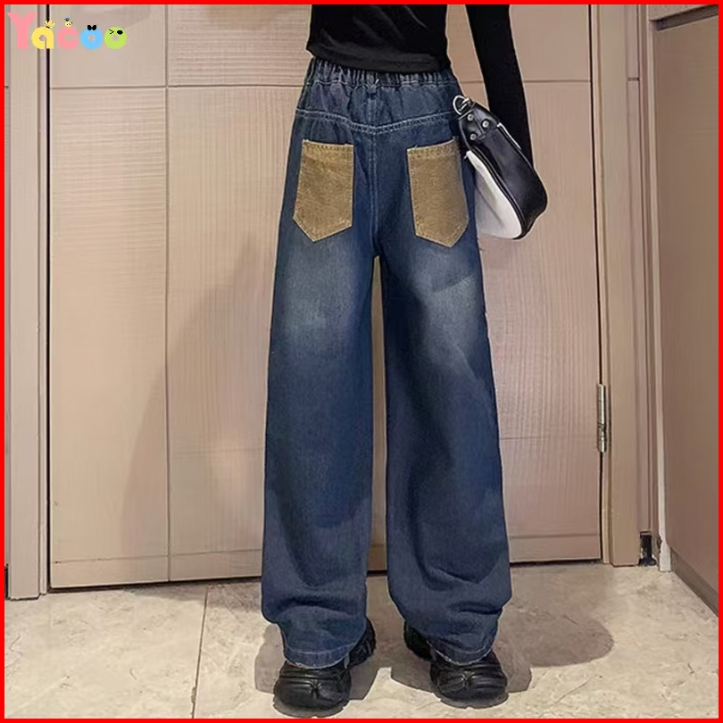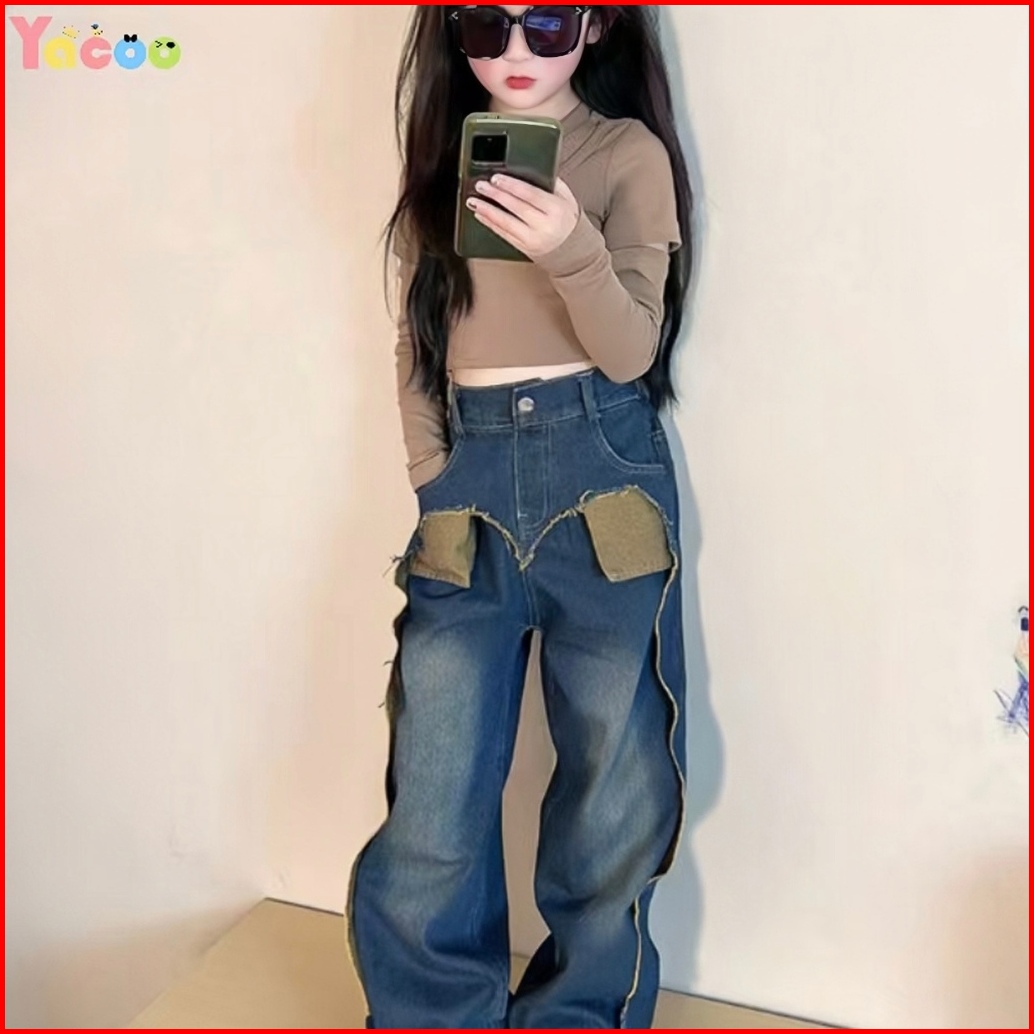 Yacoo Setelan Anak Perempuan 2-12 Tahun Korea Style - Kaos Katun Bahu Terbuka Lengan Panjang Celana Jeans Baggy Hati